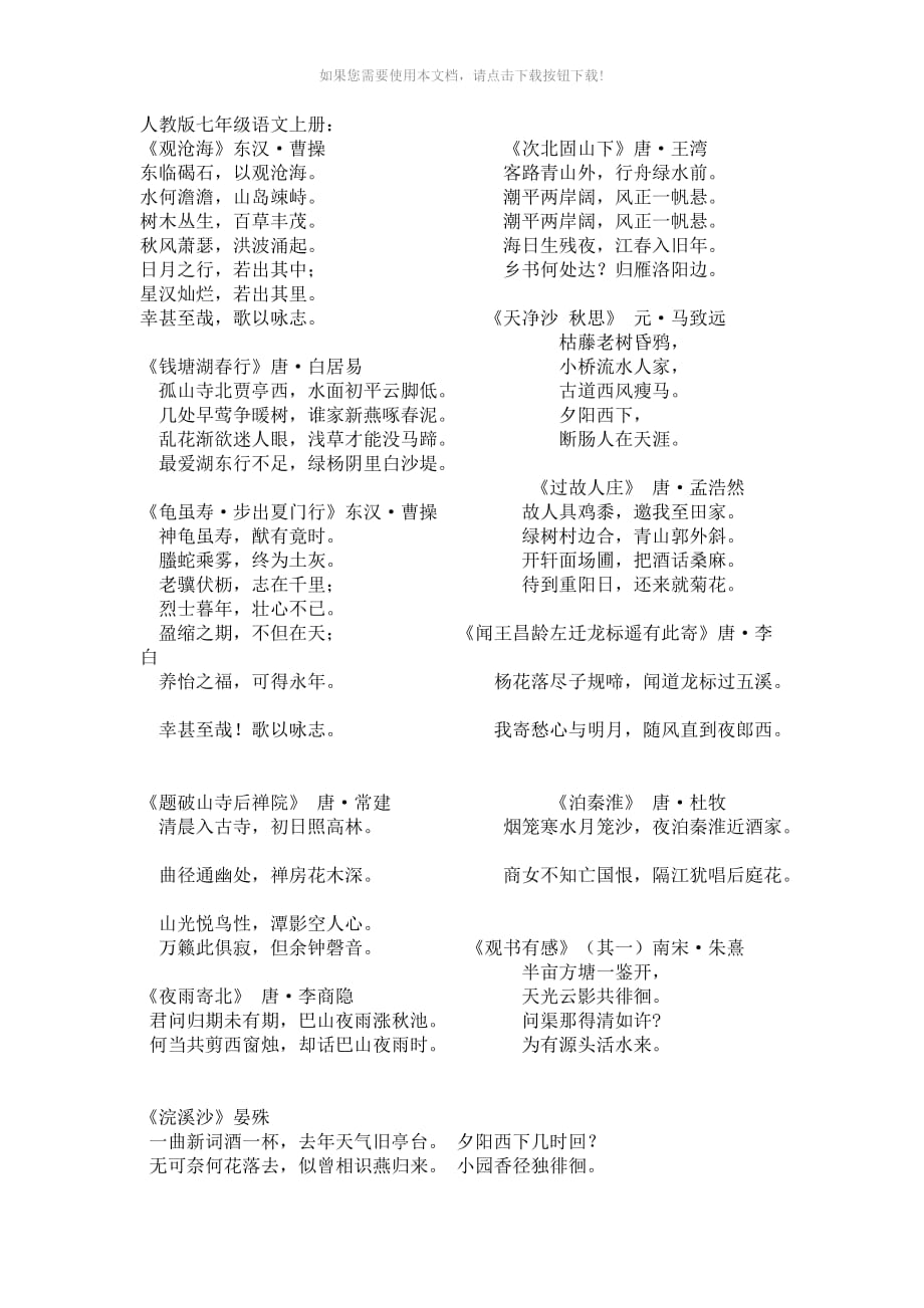 如果您需要使用本文档,请点击下载按钮下载!人教版七年级语文上册:《观沧海》东汉曹操 《次北固山下》唐王湾东临碣石,以观沧海 客路青山外,行舟绿水前水何澹澹,山岛竦峙 潮平两岸阔,风正一帆悬 树木丛生,百草丰茂 潮平两岸阔,风正一帆悬秋风萧瑟,洪波涌起 海日生残夜,江春入旧年日月之行,若出其中; 乡书何处达?归雁洛阳边星汉灿烂,若出其里 幸甚至哉,歌以咏志 《天净沙 秋思》 元马致远枯藤老树昏鸦,《钱塘湖春行》唐白居易 小桥流水人家, 孤山寺北贾亭西,水面初平云脚低 古道西风瘦马 几处早莺争暖树,谁家新燕啄春泥 夕阳西下, 乱花渐欲迷人眼,浅草才能没马蹄 断肠人在天涯最爱湖东行不足,绿杨阴里白沙堤。