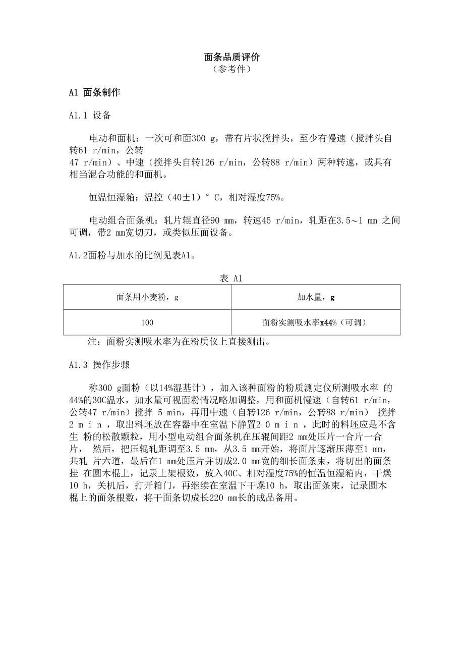 面条品质评价(参考件)A1 面条制作A1.1 设备电动和面机:一次可和面300 g,带有片状搅拌头,至少有慢速(搅拌头自 转61 r/min,公转47 r/min)、中速(搅拌头自转126 r/min,公转88 r/min)两种转速,或具有 相当混合功能的和面机恒温恒湿箱:温控(40±1)°C,相对湿度75%电动组合面条机:轧片辊直径90 mm,转速45 r/min,轧距在3.5〜1 mm 之间可调,带2 mm宽切刀,或类似压面设备A1.2面粉与加水的比例见表A1表 A1面条用小麦粉,g加水量,g100面粉实测吸水率x44%(可调)注:面粉实测吸水率为在粉质仪上直接测出A1.3 操作步骤称300 g面粉(以14%湿基计),加入该种面粉的粉质测定仪所测吸水率 的44%的30C温水,加水量可视面粉情况略加调整,用和面机慢速(自转61 r/min,公转47 r/min)搅拌 5 min,再用中速(自转126 r/min,公转88 r/min) 搅拌2 m i n ,取出料坯放在容器中在室温下静置2 0 m i n ,此时的料坯应是不含生 粉的松散颗粒,用小型电动组合面条机在压辊间距2 mm处压片一合片一合片, 然后,把压辊轧距调至3.5 mm,从3.5 mm开始,将面片逐渐压薄至1 mm,共轧 片六道,最后在1 mm处压片并切成2.0 mm宽的细长面条束,将切出的面条挂 在圆木棍上,记录上架根数,放入40C、相对湿度75%的恒温恒湿箱内,干燥 10 h,关机后,打开箱门,再继续在室温下干燥10 h,取出面条束,记录圆木 棍上的面条根数,将干面条切成长220 mm长的成品备用。