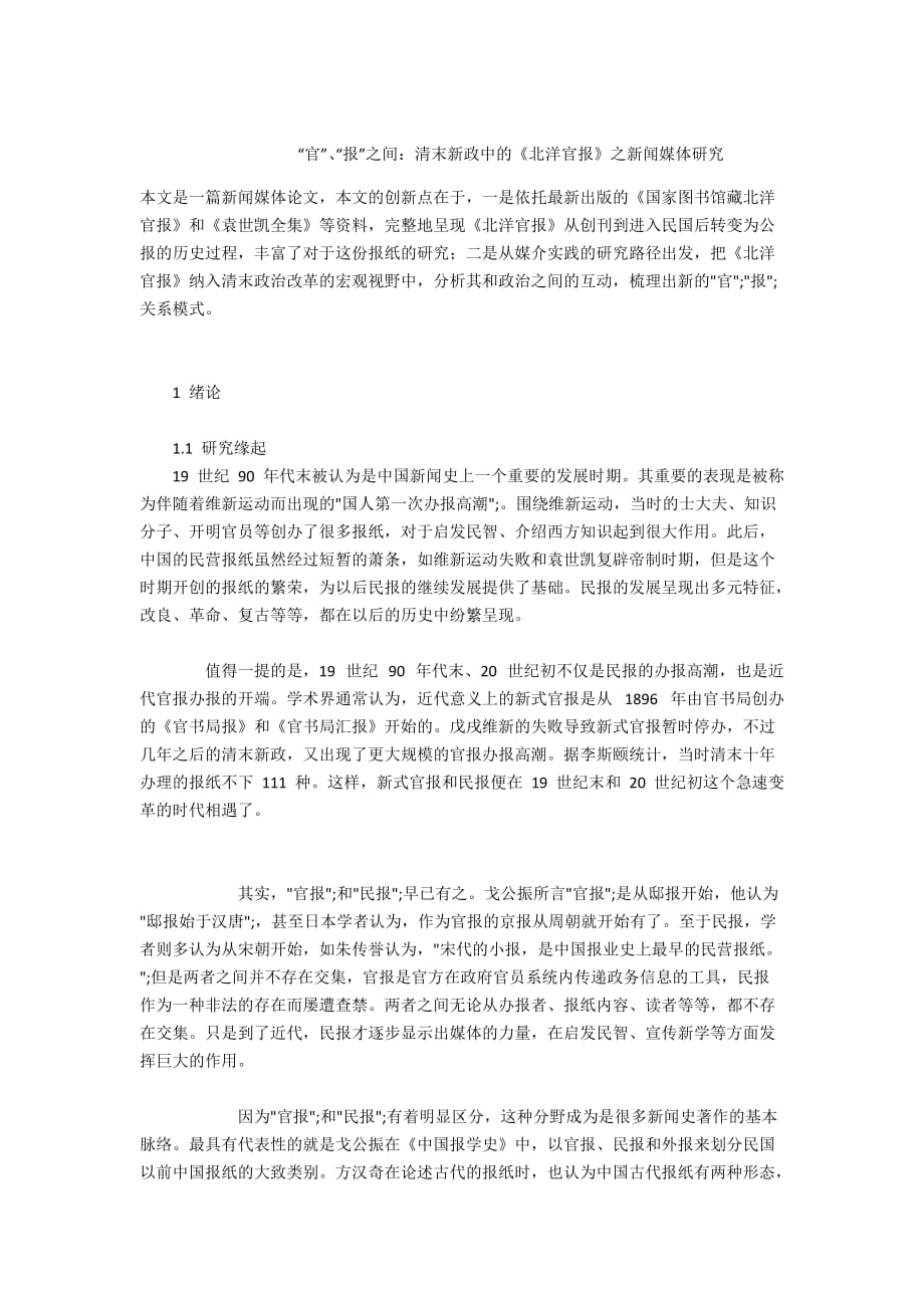 “官”、“报”之间:清末新政中的《北洋官报》之新闻媒体研究本文是一篇新闻媒体论文,本文的创新点在于,一是依托最新出版的《国家图书馆藏北洋官报》和《袁世凯全集》等资料,完整地呈现《北洋官报》从创刊到进入民国后转变为公报的历史过程,丰富了对于这份报纸的研究;二是从媒介实践的研究路径出发,把《北洋官报》纳入清末政治改革的宏观视野中,分析其和政治之间的互动,梳理出新的"官";"报";关系模式 1 绪论 1.1 研究缘起 19 世纪 90 年代末被认为是中国新闻史上一个重要的发展时期其重要的表现是被称为伴随着维新运动而出现的"国人第一次办报高潮";围绕维新运动,当时的士大夫、知识分子、开明官员等创办了很多报纸,对于启发民智、介绍西方知识起到很大作用此后,中国的民营报纸虽然经过短暂的萧条,如维新运动失败和袁世凯复辟帝制时期,但是这个时期开创的报纸的繁荣,为以后民报的继续发展提供了基础民报的发展呈现出多元特征,改良、革命、复古等等,都在以后的历史中纷繁呈现 值得一提的是,19 世纪 90 年代末、20 世纪初不仅是民报的办报高潮,也是近代官报办报的开端学术界通常认为,近代意义上的新式官报是从 1896 年由官书局创办的《官书局报》和《官书局汇报》开始的。