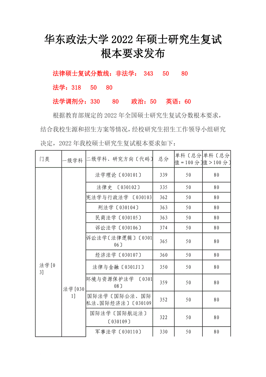 凯程法硕,国内领先的法硕法学机构,法硕考研,首选凯程!华东政法大学2022年硕士研究生复试根本要求发布法律硕士复试分数线:非法学: 343 50 80法学:318 50 80 法学调剂分:330 80 政治:50 英语:60根据教育部规定的2022年全国硕士研究生复试分数根本要求,结合我校生源和招生方案等情况,经校研究生招生工作领导小组研究决定,2022年我校硕士研究生复试根本要求如下:门类一级学科二级学科、研究方向〔代码〕总分单科〔总分值=100分〕单科〔总分值>100分〕 法学[03] 法学[0301]法学理论〔030101〕3395080法律史 〔030102〕3355080宪法学与行政法学 〔030103〕3625080刑法学〔030104〕3635080民商法学〔030105〕3635080诉讼法学〔030106〕3745080诉讼法学〔法律逻辑〕〔030106〕3655080经济法学〔030107〕3605080法律与金融〔0301J1〕3505080环境与资源保护法学 〔030108〕3595080国际法学〔国际公法、国际私法、国际经济法〕〔030109〕3525080国际法学〔国际航运法〕〔030109〕3225080军事法学〔030110〕3305080公安法学〔0301Z5〕3505080司法鉴定 〔0301Z1〕3425080知识产权 〔0301Z2〕3535080社会法学〔0301Z3〕3465080传媒法制〔0301Z7〕3215080政治学[0302]政治学理论 〔030201〕3154568比拟政治〔0302Z1〕3485080马克思主义理论[0305]马克思主义中国化研究 〔030503〕3245080马克思主义根本原理〔030501〕3385080思想政治教育 〔030505〕3355080社会主义法制教育与传播研究(0305Z1)3615080管理学[12]公共管理[1204]行政管理 〔120401〕3675080社会保障 〔120404〕3565080文化产业管理〔1204J1〕3715080社会管理〔1204Z1〕3354568公共平安管理〔1204Z2〕3445080教育经济与管理〔120403〕3354568经济学[02]应用经济学[0202]产业经济学 〔020225〕3254568金融学〔020224〕3254568国际贸易学〔020226〕3254568区域经济学〔020222〕3254568 专业学位名称〔代码〕总分单科〔总分值=100分〕单科〔总分值>100分〕法律〔非法学〕〔035101〕3435080法律〔法学〕〔035102〕318〔一志愿〕5080330〔调剂〕政治≥50,外语≥6080金融〔025100〕3254568翻译〔055100〕3505380社会工作〔035200〕3154568公共管理〔125200〕1693978说明:1、报考“退役大学生士兵专项方案〞的考生,总分和单科到达教育部统一划定的A类考生复试分数要求。