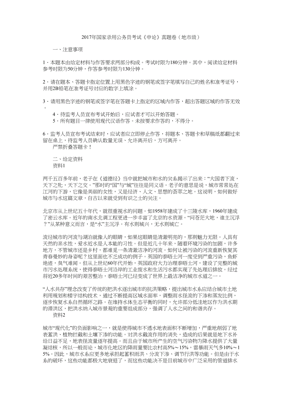 2017年国家录用公务员考试《申论》真题卷(地市级) 一、注意事项 1.本题本由给定材料与作答要求两部分构成考试时限为180分钟其中,阅读给定材料参考时限为50分钟,作答参考时限为130分钟 2.请在题本、答题卡指定位置上用黑色字迹的钢笔或签字笔填写自己的姓名和准考证号,并用2B铅笔在准考证号对应的数字上填涂 3.请用黑色字迹的钢笔或签字笔在答题卡上指定的区域内作答,超出答题区域的作答无效 4.待监考人员宣布考试开始后,应试者才可以开始答题 5.所有题目一律使用现代汉语作答未按要求作答的,不得分 6.监考人员宣布考试结束时,应试者应立即停止作答,将题本、答题卡和草稿纸都翻过来留在桌上,待监考人员确认数量无误、允许离开后,方可离开 严禁折叠答题卡! 二、给定资料 资料1 两千五百多年前,老子在《道德经》当中就把城市和水的关系揭示了出来:“大国者下流,天下之牝,天下之交那时的“国”与“城”往往是同义语老子的意思是说,城市常常处在江河的下游,它像是美丽的女性,又是经济、人文、思想的荟萃之地这说明,如何做好城市与水这篇文章,自古以来就受到有识之士的关注 北京市从上世纪五十年代,就很重视水的问题。