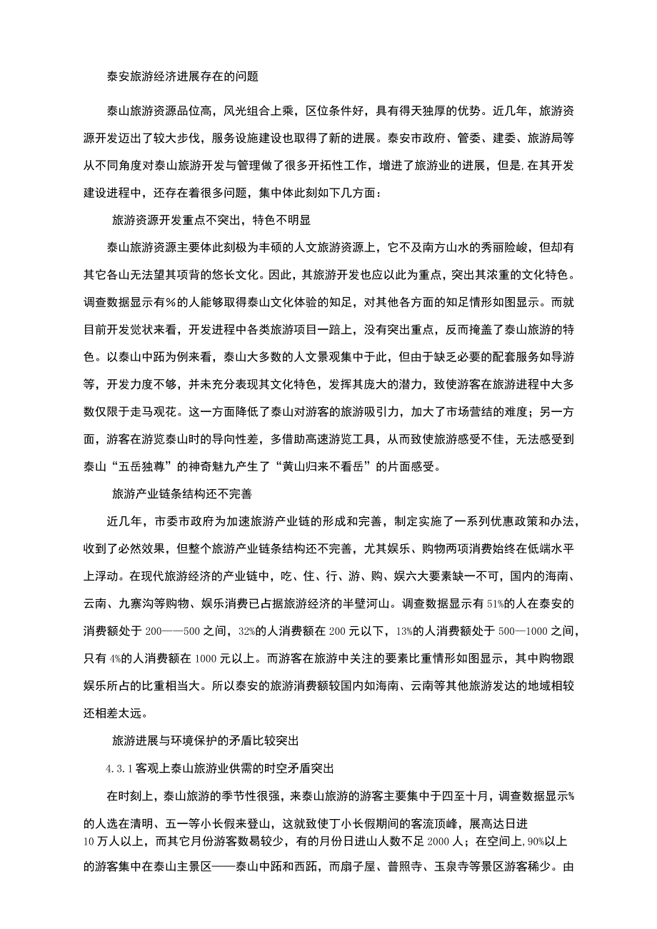 由于供需的时空矛盾,致使泰山旅游资源得不到充分利用和有效保护,生态环境日趋恶化,旅游管理的难度大,安全隐患多,服务与游览质量难以保证调查数据显示%的游客对景区内的公共服务不满意上述问题最终致使游客游览感受降低,对泰山整体形象的评价不高4.3.2 景区的城市化、商业化偏向日趋严峻泰山景区内交通状况取得改善,服务设施不断增加,方便游客的同时也使景区的城市化、商业化偏向日趋严峻在岱顶,常住的管理和服务人员多达数百人,所排放的生活垃圾、污水严峻危及生态环境;过量过乱的店铺地摊、不绝于耳的叫卖声、体量庞大的商业广告牌等,造成了过于浓重的商业气氛,与泰山自然风貌和人文名胜极不和谐国内外、省内外客源地进展不够平衡,市场营销针对性不强泰安每一年接待国内外游客达数百万人,而其中国际游客仅万人,这与泰山在国际上的知名度很不相称大量国际游客对泰山悠长的历史文化感兴趣,专门是港澳台同胞、东南亚游客,和客居国外的华人、华侨,对中国文化有着深厚的情感,而泰山之游恰恰能知足他们的愿望在泰山的对外宣传、营错进程中,应抓住这一特点,充分利用香港及东南亚本地具有影响的旅行社,增强海外游客的进入度,推动泰山的国际旅游另一方面,据调查数据显示有%的游客来自省内,%的游客来自周边及国内其他省区,而来自长三角、珠三角等沿海某些发达地域的游客不足10%。