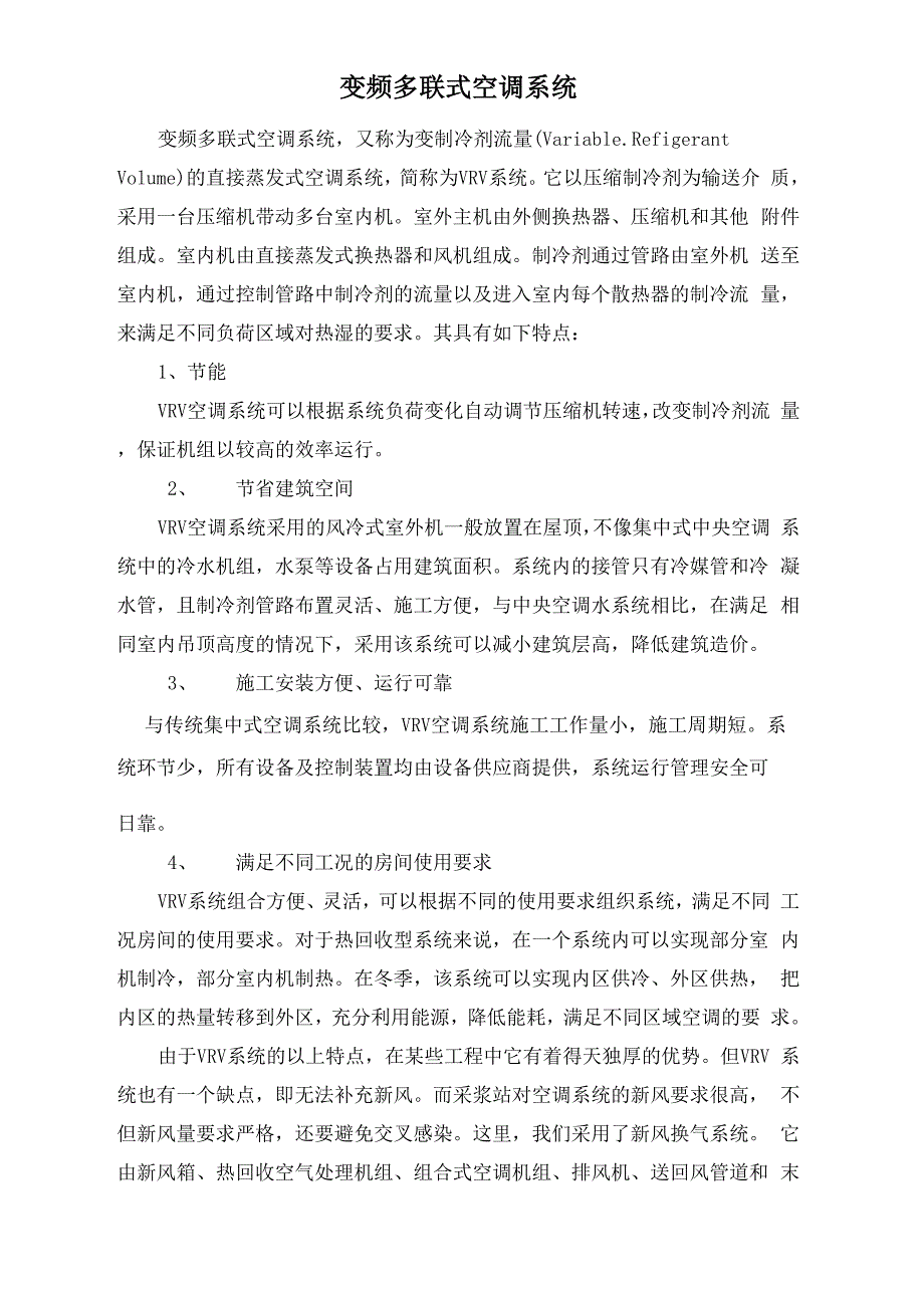 变频多联式空调系统变频多联式空调系统,又称为变制冷剂流量(Variable.RefigerantVolume)的直接蒸发式空调系统,简称为VRV系统它以压缩制冷剂为输送介 质,采用一台压缩机带动多台室内机室外主机由外侧换热器、压缩机和其他 附件组成室内机由直接蒸发式换热器和风机组成制冷剂通过管路由室外机 送至室内机,通过控制管路中制冷剂的流量以及进入室内每个散热器的制冷流 量,来满足不同负荷区域对热湿的要求其具有如下特点:1、节能VRV空调系统可以根据系统负荷变化自动调节压缩机转速,改变制冷剂流 量,保证机组以较高的效率运行2、 节省建筑空间VRV空调系统采用的风冷式室外机一般放置在屋顶,不像集中式中央空调 系统中的冷水机组,水泵等设备占用建筑面积系统内的接管只有冷媒管和冷 凝水管,且制冷剂管路布置灵活、施工方便,与中央空调水系统相比,在满足 相同室内吊顶高度的情况下,采用该系统可以减小建筑层高,降低建筑造价3、 施工安装方便、运行可靠与传统集中式空调系统比较,VRV空调系统施工工作量小,施工周期短系 统环节少,所有设备及控制装置均由设备供应商提供,系统运行管理安全可日靠4、 满足不同工况的房间使用要求VRV系统组合方便、灵活,可以根据不同的使用要求组织系统,满足不同 工况房间的使用要求。