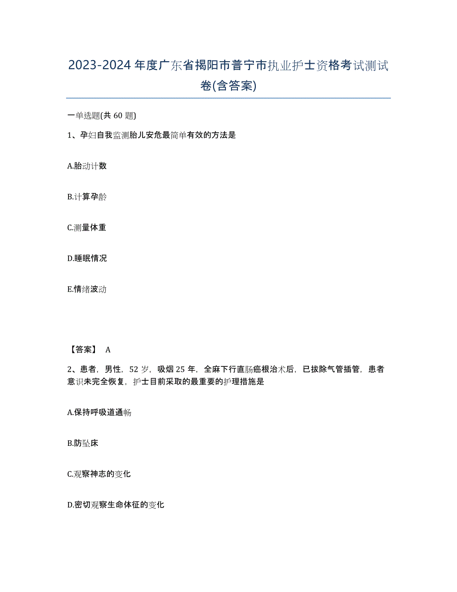 2023-2024年度广东省揭阳市普宁市执业护士资格考试测试卷(含答案)一单选题(共60题)1、孕妇自我监测胎儿安危最简单有效的方法是A.胎动计数B.计算孕龄C.测量体重D.睡眠情况E.情绪波动【答案】 A2、患者,男性,52岁,吸烟25年,全麻下行直肠癌根治术后,已拔除气管插管,患者意识未完全恢复,护士目前采取的最重要的护理措施是A.保持呼吸道通畅B.防坠床C.观察神志的变化D.密切观察生命体征的变化E.保暖【答案】 A3、4个月患儿,腹泻伴重度脱水,经补液后脱水征消失,但突然出现呼吸变浅,反应差,腹胀体检:T36.8℃,R30次/分,精神萎靡,面色苍白,前囟平,心音较低,腹胀,肠鸣音减弱,皮肤弹性可,膝反射消失最可能的并发症是A.败血症B.低钾血症C.重症肌无力D.中毒性心肌炎E.中毒性肠麻痹【答案】 B4、患者女性,50岁,无痛性肉眼血尿2个月查体无异常发现,尿脱落细胞学检查发现癌细胞,可以协助确诊的检查是A.腹部平片B.肾动脉造影C.膀胱镜检查D.排泄尿路造影E.KUB平片【答案】 C5、患者男,40岁,脊髓损伤,双下肢截瘫住院近2周,责任护土护理患者时,错误的做法是( )。