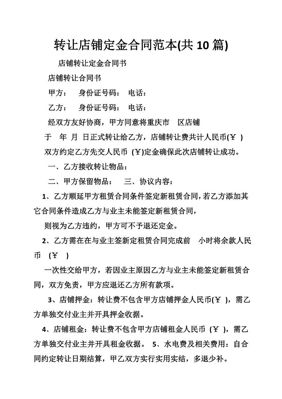 转让店铺定金合同范本(共10篇) 店铺转让定金合同书 店铺转让合同书 甲方: 身份证号码: : 乙方: 身份证号码: : 经双方友好协商,甲方同意将重庆市 区店铺 于 年 月 日正式转让给乙方,店铺转让费共计人民币(¥ ) 双方约定乙方先交人民币 (¥)定金确保此次店铺转让成功 一﹑乙方接收转让物品: 二﹑甲方保留物品: 三﹑协议内容: 1﹑乙方顺延甲方租赁合同条件签定新租赁合同,若乙方添加其它合同条件造成乙方与业主未能签定新租赁合同, 则视为乙方违约,甲方可不予退还定金 2﹑乙方需在在与业主签新定租赁合同完成前 小时将余款人民币 (¥ ) 一次性交给甲方,若因业主原因乙方与业主未能签定新租赁合同,双方免责,甲方应退还乙方所有款项 3、店铺押金:转让费不包含甲方店铺押金人民币(¥ ),需乙方单独交付业主并开具押金收据 4﹑店铺租金:转让费不包含甲方店铺租金人民币 (¥ ),需乙方单独交付业主并开具租金收据 5﹑水电费及相关费用:自合同约定转让日期结算,甲乙双方实行实用实结,多退少补 6﹑甲方可根据乙方需要协助乙方办理与业主签定新租赁合同 7﹑合同签定日起双方不得反悔,否则视为违约,双倍定金赔偿。