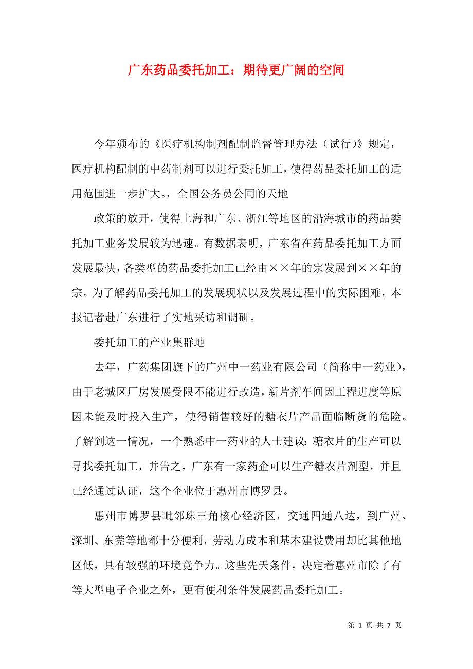 广东药品委托加工:期待更广阔的空间 今年颁布的《医疗机构制剂配制监督管理办法(试行)》规定,医疗机构配制的中药制剂可以进行委托加工,使得药品委托加工的适用范围进一步扩大全国公务员公同的天地 政策的放开,使得上海和广东、浙江等地区的沿海城市的药品委托加工业务发展较为迅速有数据表明,广东省在药品委托加工方面发展最快,各类型的药品委托加工已经由年的宗发展到年的宗为了解药品委托加工的发展现状以及发展过程中的实际困难,本报记者赴广东进行了实地采访和调研 委托加工的产业集群地 去年,广药集团旗下的广州中一药业有限公司(简称中一药业),由于老城区厂房发展受限不能进行改造,新片剂车间因工程进度等原因未能及时投入生产,使得销售较好的糖衣片产品面临断货的危险了解到这一情况,一个熟悉中一药业的人士建议:糖衣片的生产可以寻找委托加工,并告之,广东有一家药企可以生产糖衣片剂型,并且已经通过认证,这个企业位于惠州市博罗县 惠州市博罗县毗邻珠三角核心经济区,交通四通八达,到广州、深圳、东莞等地都十分便利,劳动力成本和基本建设费用却比其他地区低,具有较强的环境竞争力这些先天条件,决定着惠州市除了有等大型电子企业之外,更有便利条件发展药品委托加工。