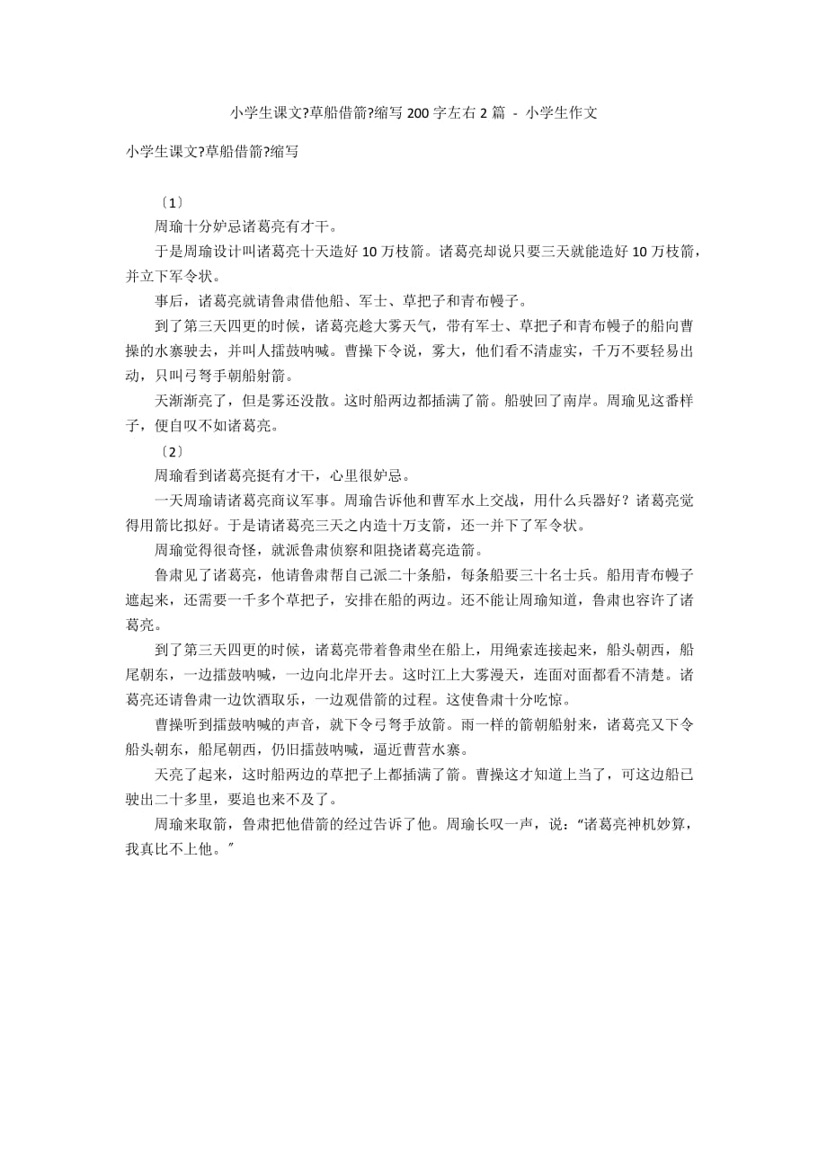 小学生课文?草船借箭?缩写200字左右2篇 - 小学生作文 小学生课文?草船借箭?缩写 〔1〕 周瑜十分妒忌诸葛亮有才干 于是周瑜设计叫诸葛亮十天造好10万枝箭诸葛亮却说只要三天就能造好10万枝箭,并立下军令状 事后,诸葛亮就请鲁肃借他船、军士、草把子和青布幔子 到了第三天四更的时候,诸葛亮趁大雾天气,带有军士、草把子和青布幔子的船向曹操的水寨驶去,并叫人擂鼓呐喊曹操下令说,雾大,他们看不清虚实,千万不要轻易出动,只叫弓弩手朝船射箭 天渐渐亮了,但是雾还没散这时船两边都插满了箭船驶回了南岸周瑜见这番样子,便自叹不如诸葛亮 〔2〕 周瑜看到诸葛亮挺有才干,心里很妒忌 一天周瑜请诸葛亮商议军事周瑜告诉他和曹军水上交战,用什么兵器好?诸葛亮觉得用箭比拟好于是请诸葛亮三天之内造十万支箭,还一并下了军令状 周瑜觉得很奇怪,就派鲁肃侦察和阻挠诸葛亮造箭 鲁肃见了诸葛亮,他请鲁肃帮自己派二十条船,每条船要三十名士兵船用青布幔子遮起来,还需要一千多个草把子,安排在船的两边还不能让周瑜知道,鲁肃也容许了诸葛亮 到了第三天四更的时候,诸葛亮带着鲁肃坐在船上,用绳索连接起来,船头朝西,船尾朝东,一边擂鼓呐喊,一边向北岸开去。