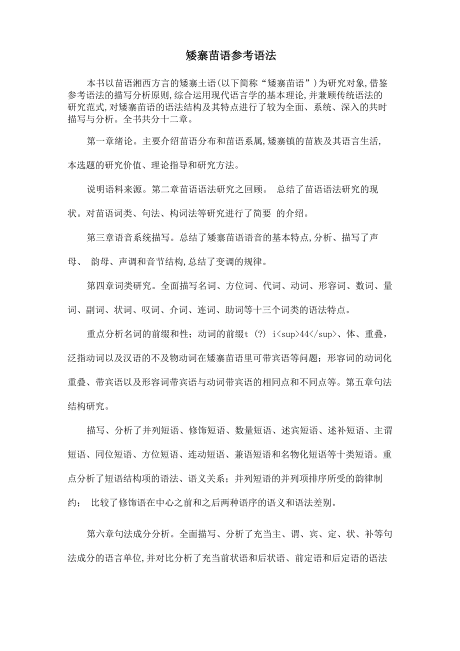矮寨苗语语法的基本特点是:以分析性为主但又兼有黏着性特点创新之处 主要有:首次对矮寨苗语语法进行比较全面和深入的研究以下几个方面的研究是前人没有做过的如:“动词+名词宾语”和“形容词+名词宾语”的对比分析;被动句、差比句研究等以下几个方面是前人做过但不深入的,本书做了比较深入的研究如:动词 前缀t (?) i44的多功能性和来源;四音格构词特点及其形成机制; 动词重叠的语法意义等不足之处是理论深度不够对某些语法现象描写的多,解释的少 全书共有五个附录:1.长篇语料; 2.自然话语 3 篇; 3.谜语 92 个; 4.四音 格词 1000 个; 5.分类词汇 3000 个。