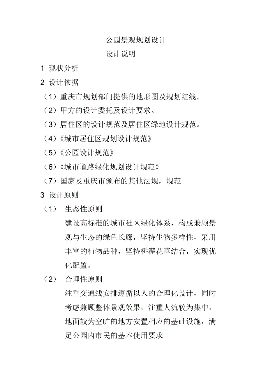 公园景观规划设计设计说明1 现状分析2 设计依据(1)重庆市规划部门提供的地形图及规划红线2)甲方的设计委托及设计要求3)居住区的设计规范及居住区绿地设计规范4) 《城市居住区规划设计规范》(5) 《公园设计规范》(6) 《城市道路绿化规划设计规范》(7)国家及重庆市颁布的其他法规,规范3 设计原则(1) 生态性原则建设高标准的城市社区绿化体系,构成兼顾景观与生态的绿色长廊,坚持生物多样性,采用丰富的植物品种,坚持桥灌花草结合,实现优化配置2) 合理性原则注重交通线安排遵循以人的合理化设计,同时考虑兼顾整体景观效果,注重人流较为集中,地面较为空旷的地方安置相应的基础设施,满足公园内市民的基本使用要求(3) 协议性原则协调生态,社会,经济效益的关系,保证生态效益的充分发挥协调社区公园内各功能地块的总体景观建设,保证城市公园绿化体系结构得以良性的整体发展4)服务性原则朝天门南桥头地区属于城市公园, 服务对象主要是城市居民, 体现以人文本的设计原则, 使城市公园体系更好地服务于重庆市社会,文化,经济的发展4 规划构思(1)运用丰富的植物元素与人工造景手法,充分考虑植物的层次, 色彩等各项特性, 结合植物生长变化创造出线性四维空间, 改变以往的单一规则式种植,运用规则与自然相结合, 灌木与乔木相搭配的种植方式, 着重体现物种多样性和植物的层次变化性, 体现景观多样性, 运用各种特色的花灌木与地被组合成一条绚丽斑斓的花带,营造出新的城市景观。
