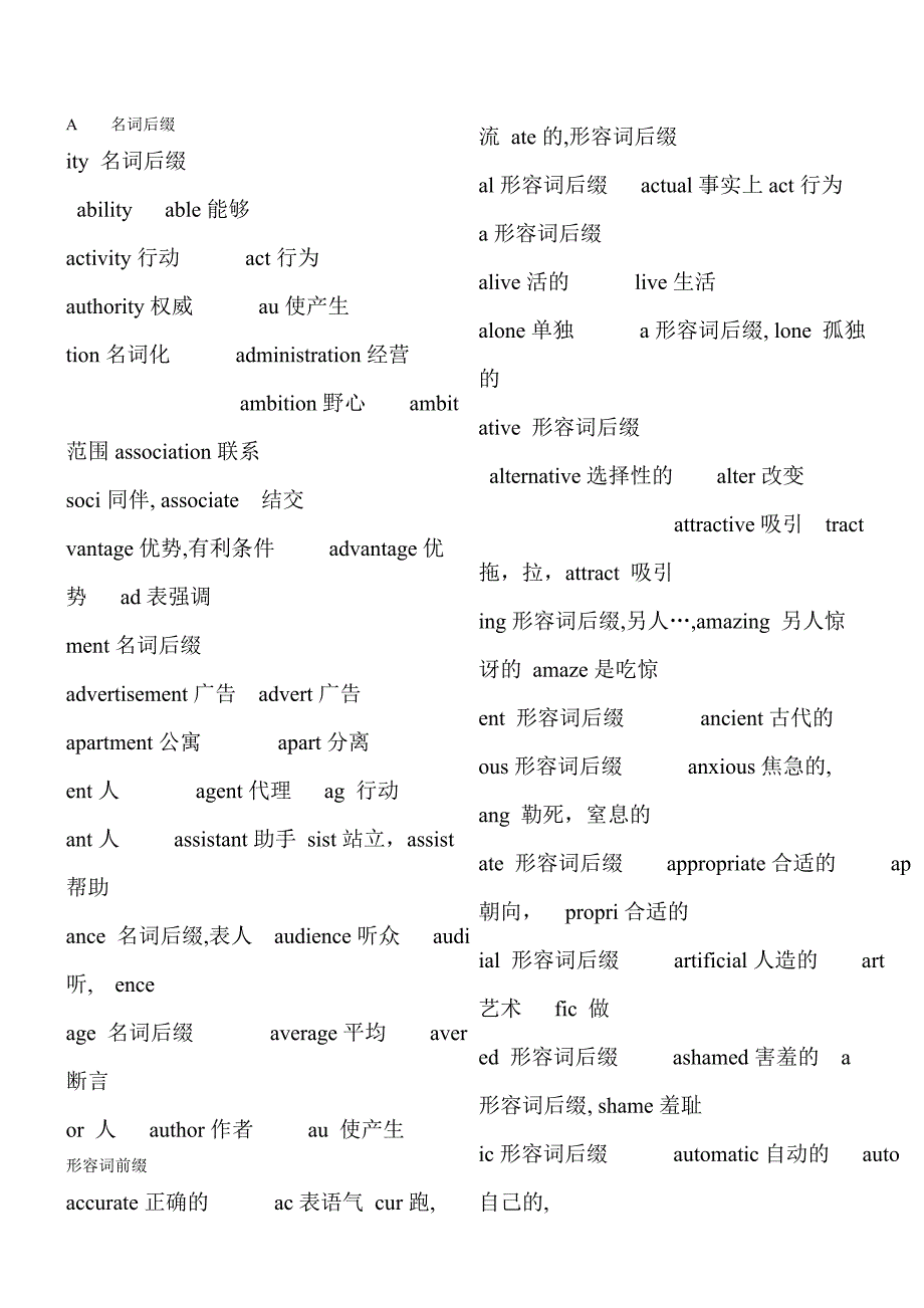 A 名词后缀ity 名词后缀 ability able能够activity行动 act行为 authority权威 au使产生 tion名词化 administration经营 ambition野心 ambit范围association联系 soci同伴, associate 结交vantage优势,有利条件 advantage优势 ad表强调 ment名词后缀 advertisement广告 advert广告 apartment公寓 apart分离ent人 agent代理 ag 行动 ant人 assistant助手 sist站立,assist 帮助 ance 名词后缀,表人 audience听众 audi听, ence age 名词后缀 average平均 aver 断言 or 人 author作者 au 使产生 形容词前缀accurate正确的 ac表语气 cur跑,流 ate的,形容词后缀 al形容词后缀 actual事实上act行为 a形容词后缀alive活的 live生活 alone单独 a形容词后缀, lone 孤独的ative 形容词后缀 alternative选择性的 alter改变 attractive吸引 tract拖,拉,attract 吸引ing形容词后缀,另人…,amazing 另人惊讶的 amaze是吃惊 ent 形容词后缀 ancient古代的 ous形容词后缀 anxious焦急的, ang 勒死,窒息的 ate 形容词后缀 appropriate合适的 ap朝向, propri合适的 ial 形容词后缀 artificial人造的 art 艺术 fic 做 ed 形容词后缀 ashamed害羞的 a形容词后缀, shame羞耻 ic形容词后缀 automatic自动的 auto自己的, ful 形容词后缀 awful糟糕的 awe敬畏 able能的 available可获得的 avail有益的 动词后缀ize动词后缀 apologize 道歉 log ,说 apology 道歉,名词appreciate感激 ap 朝向,preci价值, ate 动词后缀, 表示粘住副词后缀ly 副词后缀 apparently明显的 par 出现,apparent明显的 合成词afterwards向后 after过后, wards 表方向aircraft飞机 air空中 craft工艺airline定期航线 air空中, line线 airport机场 air空中, port港口anybody/anyone任何人any任何, body人anything任何事 any任何, thing 东西anyway任何方法 any任何, way方法 anywhere任何地方any任何, where地方 其它规律词汇abandon ban禁止 放弃ab一前缀, bout回合 about大约admit承认 mit送,投a副词标志above在上面 over上面 aside旁边 a副词后缀, side旁边 abroad往国外 broad(广阔的) accept接受 ac表强调 cept拿access进入 ac表强调 cess 进入accident事故 ac 表示强调 cid 落according 按照 ac表语气 cord绳索account计算 ac表语气 count计算achieve达到 a表示方向,chieve ,chief 主要的address地址 ad表强调 dress穿,服装admire羡慕 ad 朝向,mire惊讶adopt收养 ad 表示趋向,opt 希望adult成年人ad 表示方向,ul表示滋养 advice建议 ad 朝向,vice 看affair事件 af加强语气, fair公平的affect影响 af fect做afford支付 af ford浅滩after之后 aft表示后面agree同意 gree 同意ahead前面 a 副词开头 head 头alarm警告 al 朝向,arm武器almost几乎 al 全部, most多数的along沿着 a与…相对面, long长的 already已经 al表全部, ready有准备的 although/though虽然 al全部, though虽然amusing 逗人的 amuse使发笑, ing 令人…analyse分析 ana在…上,lyse 松angle角 gle,gon 表示角度announce声称 nounce 说, 发言another另一个 an一 ,other其他的 appeal呼吁 ap 朝向,peal 驱使appear呈现 ap加强语气, par出现 apply申请 ap 朝向,ply折叠appoint指定 ap加强语气, point 指着approach方法 ap 朝向,proach接近approve赞成 ap朝向, prove检查architect建筑师 arch主要的, tect 建造者army军队 arm武器arrange安排 ar朝向, range行列around围绕 round圆arrest逮捕 ar 朝向,re 后面, st站着arrive到达 arr 抵达 article文章 art 艺术 cle 表示个别的后缀aspect方面 a 朝向,spect 看assume认为 sume拿起astonish惊讶 stone 石头 nishatmosphere气氛 atom水蒸汽, sphere球状物attach连接 tach栓attack袭击 tack袭击attempt企图 tempt尝试attend参加 tend张开attitude态度 tude 趋向avoid逃避 void 空的award奖励 ward保护aware注意到 ware 注意B 名词后缀business事情 busy 忙,ness 名词后缀basket篮子 et 名词后缀,表示小形容词后缀boring令人厌烦的 bore使人烦恼,ing 形容词后缀,象形词balance平衡 ba lance标枪,切开 band联合 /b/ 有两点连接的意思, and 和,且battle 战役 bat打, l 表示动作的重复boss老板 ss 表示人burn烧 r表燃烧button纽扣 butt粗大的一端合成词background背景 back后面的 ground 地面baseball棒球 base底部 ball 球其它规律词汇bar横木 来自拉丁文 barrabefore以前 fore 在前面behave 举动 have有,拿behind后面 hind 在后面believe相信 lieve乐意的belong属于 be ,使之,long 长久,below下面 low低下的beneath在…下面 neath在…下benefit获益 bene有益, fit 合适besides除…之外 beside 在旁边,-sbeyond在远处 yond那边的bit小块 it 在结尾,表示小bite咬 bit马嚼子bitter痛苦的 bit咬 broad宽阔的 road 路broadcast广播 broad广阔的, cast仍budget预算 budge表移动C 名词后缀age 名词后缀 cabbage 卷心菜 cap 头 le 名词后缀,表示小 cable大电报 aign 名词字尾 campaign战役 camp 田野 ate 名词后缀 candidate候选人 candid坦直的 ity 名词后缀 capacity能力 charity慈善 et名词后缀, 含有小的含义carpet地毯 le名词后缀,含有小的含义 castle城堡 ing 使其名词化 ceiling天花板 ceil装天花板 ceremony仪式 mony 是ment 的变化型,即名词后缀er名词后缀 character特征er 名词后缀,表示人 customer消费者 custom习惯,风俗 er 名词后缀 corner角落 er 表人 consumer消费者 sume拿,取 counter计算器 count 数 cover覆盖 v 像一个覆盖物形状 ice 名词后缀 choice选择 stance 名词后缀 表姿态 circumstance环境 circum 环境 en 表人的后缀 citizen市民,公民 city 城市 ent名词后缀 client客户 component成分 com 一起,pon 放置 continent大陆 con 一起,tin 保持 ee被…的人,被委托的人 committee委员会 ence名词后缀 conference会议 confer 协商 consequence结果 con 一起,sequ跟随 tion名词后缀 competition竞争 compete 竞争composition作文 pos放compos
