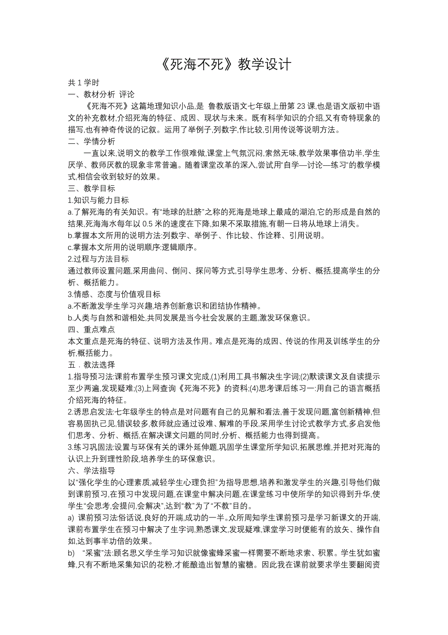 《死海不死》教学设计共1学时一、教材分析 评论 《死海不死》这篇地理知识小品,是 鲁教版语文七年级上册第23课,也是语文版初中语文的补充教材,介绍死海的特征、成因、现状与未来既有科学知识的介绍,又有奇特现象的描写,也有神奇传说的记叙运用了举例子,列数字,作比较,引用传说等说明方法二、学情分析 一直以来,说明文的教学工作很难做,课堂上气氛沉闷,索然无味,教学效果事倍功半,学生厌学、教师厌教的现象非常普遍随着课堂改革的深入,尝试用“自学—讨论—练习“的教学模式,相信会收到较好的效果三、教学目标1.知识与能力目标a.了解死海的有关知识有“地球的肚脐”之称的死海是地球上最咸的湖泊,它的形成是自然的结果,死海海水每年以0.5米的速度在下降,如果不采取措施,有朝一日将从地球上消失b.掌握本文所用的说明方法:列数字、举例子、作比较、作诠释、引用说明c.掌握本文所用的说明顺序:逻辑顺序2.过程与方法目标通过教师设置问题,采用曲问、倒问、探问等方式,引导学生思考、分析、概括,提高学生的分析、概括能力3.情感、态度与价值观目标a.不断激发学生学习兴趣,培养创新意识和团结协作精神b.人类与自然和谐相处,共同发展是当今社会发展的主题,激发环保意识。
