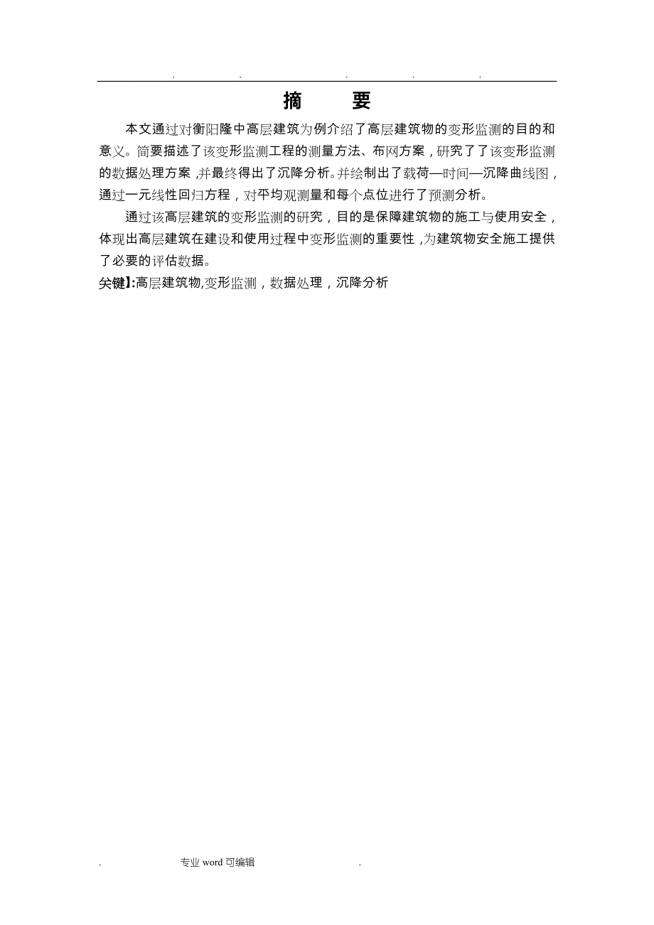 . . . .摘 要本文通过对衡阳隆中高层建筑为例介绍了高层建筑物的变形监测的目的和意义简要描述了该变形监测工程的测量方法、布网方案,研究了了该变形监测的数据处理方案,并最终得出了沉降分析并绘制出了载荷—时间—沉降曲线图,通过一元线性回归方程,对平均观测量和每个点位进行了预测分析通过该高层建筑的变形监测的研究,目的是保障建筑物的施工与使用安全,体现出高层建筑在建设和使用过程中变形监测的重要性,为建筑物安全施工提供了必要的评估数据关键】:高层建筑物,变形监测,数据处理,沉降分析. 专业word可编辑 .. . . . .AbstractThis article through to Hengyang this high-rise building for example introduces the high-level building deformation monitoring of purpose and meaning. A summary of the deformation monitoring project measurement methods, cloth nets scheme, the study of deformation monitoring it data processing scheme, and concluded that settlement analysis. And map out the load-time-settlement curve, the settlement of the building has a system of continuous judgment and analysis.Through the high-rise building deformation monitoring of the research, the purpose is to protect the building construction and use safety, manifests the high-rise buildings in the construction and utilization of the importance of deformation monitoring, for building construction safety provided the necessary assessment data.Keywords:High-rise buildings, Deformation monitoring, Data processing, Settlement analysis . . . . .目 录摘 要 IAbstract II第一章 绪论 11.1本课题变形监测的基本概念 11.2本课题变形监测的内容 11.3本课题变形监测的目的意义 21.4本课题变形监测技术及其发展 3第二章 工程要求 52.1工程概述 52.2测量依据 52.3测量要求 52.4主要技术精度指标 62.5控制网的设计 62.5.1沉降控制网布设的基本要点 62.5.2布网的目的 72.5.3布网的原则 72.5.4变形网的优化方法 82.5.5本工程现场布网具体原则 92.6测量方法 92.6.1测量仪器设备 92.6.2精度控制 92.6.3沉降观测精度估算 92.6.4观测方案 92.6.5观测工期 102.6.6主要操作要求 10第三章 数据处理 123.1变形监测数据处理的三大平差方法 123.2间接平差在数据处理的应用 123.3按间接平差法求平差值的计算步骤 133.4沉降数据平差后结果 13第四章 变形监测分析 154.1变形监测沉降结果分析 154.2沉降图 154.3一元线性回归分析 16结 论 18参考文献 19致 谢 20. . . . .第一章 绪论1.1本课题变形监测的基本概念变形监测是自然界普遍存在的现象,它是指变形体在各种荷载作用下,其形状、大小及位置在时间域和空间域中的变化。