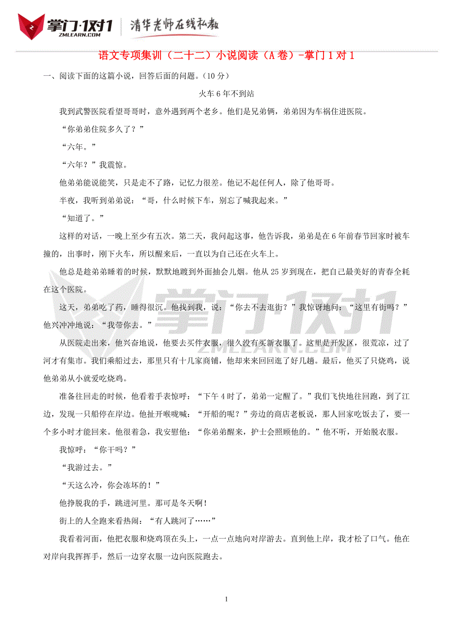 1语文专项集训(二十二)小说阅读(A 卷)-掌门 1 对 1一、阅读下面的这篇小说,回答后面的问题 (10 分)火车 6 年不到站我到武警医院看望哥哥时,意外遇到两个老乡他们是兄弟俩,弟弟因为车祸住进医院 “你弟弟住院多久了?”“六年六年?”我震惊他弟弟能说能笑,只是走不了路,记忆力很差他记不起任何人,除了他哥哥半夜,我听到弟弟说:“哥,什么时候下车,别忘了喊我起来这样的对话,一晚上至少有五次第二天,我问起这事,他告诉我,弟弟是在 6 年前春节回家时被车撞的,出事时,刚下火车,所以醒来后,一直以为自己还在火车上他总是趁弟弟睡着的时候,默默地踱到外面抽会儿烟他从 25 岁到现在,把自己最美好的青春全耗在这个医院这天,弟弟吃了药,睡得很沉他找到我,说:“你去不去逛街?”我惊讶地问:“这里有街吗?”他兴冲冲地说:“我带你去从医院走出来,他兴奋地说,他要去买件衣服,很久没有买新衣服了这里是开发区,很荒凉,过了河才有集市我们乘船过去,那里只有十几家商铺,他却来来回回逛了好几趟最后,他买了只烧鸡,说他弟弟从小就爱吃烧鸡准备往回走的时候,他看着手表惊呼:“下午 4 时了,弟弟一定醒了我们飞快地往回跑,到了江边,发现一只船停在岸边。