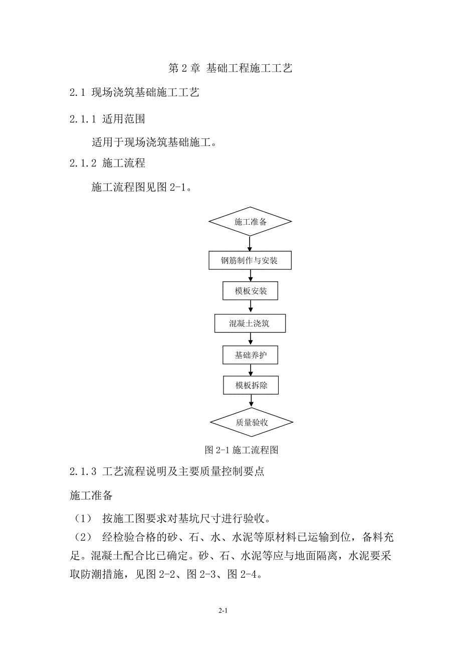 第2章 基础工程施工工艺2.1 现场浇筑基础施工工艺2.1.1 适用范围适用于现场浇筑基础施工2.1.2 施工流程施工流程图见图2-1 施工准备钢筋制作与安装混凝土浇筑模板安装基础养护模板拆除 质量验收 图2-1施工流程图2.1.3 工艺流程说明及主要质量控制要点施工准备(1) 按施工图要求对基坑尺寸进行验收2) 经检验合格的砂、石、水、水泥等原材料已运输到位,备料充足混凝土配合比已确定砂、石、水泥等应与地面隔离,水泥要采取防潮措施,见图2-2、图2-3、图2-4图2-2现场原材料堆放示例一 图2-3现场原材料堆放示例二图2-4现场原材料堆放示例三(在底部插入垫木垫高)(3) 施工用机具准备就绪2.1.3.2 钢筋制作与安装(1) 一般规定:1) 钢筋的使用必须符合施工图要求,钢筋进场时,应检查该批钢筋的产品合格证和出场检验报告,并按现行有关国家标准的规定抽取试件作力学性能检验,其质量必须符合有关标准的规定检查数量:按进场的批次和产品的抽样检验方案确定2) 钢筋应平直、无损伤,表面不得有裂纹、油污、颗粒状或片状老锈3) 基础配筋按施工图要求布置排列2) 钢筋加工1)钢筋弯制前必须对照施工图对钢筋的级别进行核对,严禁混淆。
