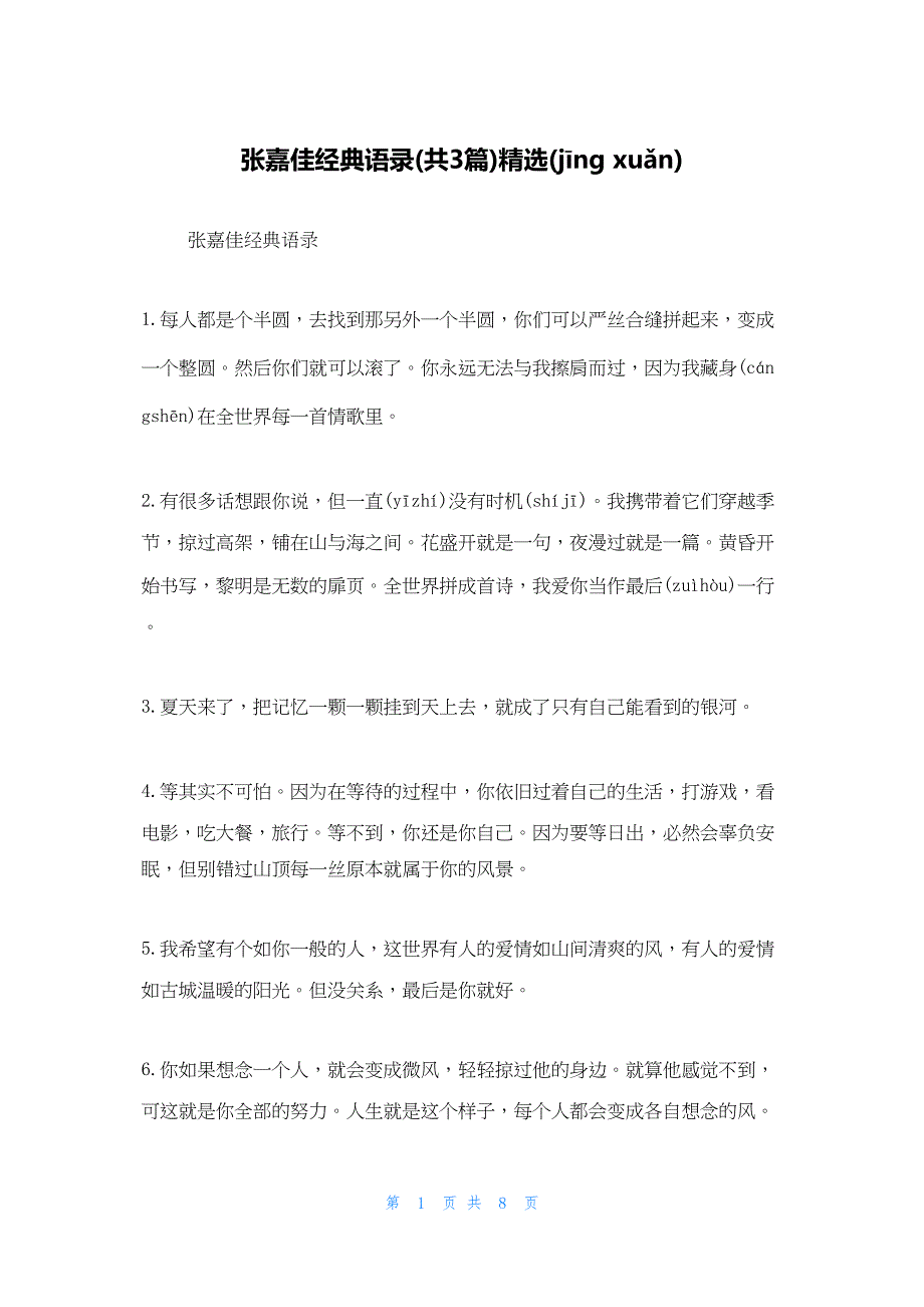张嘉佳经典语录(共3篇)精选(jīnɡ xuǎn) 张嘉佳经典语录 1.每人都是个半圆,去找到那另外一个半圆,你们可以严丝合缝拼起来,变成一个整圆然后你们就可以滚了你永远无法与我擦肩而过,因为我藏身(cángshēn)在全世界每一首情歌里 2.有很多话想跟你说,但一直(yīzhí)没有时机(shíjī)我携带着它们穿越季节,掠过高架,铺在山与海之间花盛开就是一句,夜漫过就是一篇黄昏开始书写,黎明是无数的扉页全世界拼成首诗,我爱你当作最后(zuìhòu)一行 3.夏天来了,把记忆一颗一颗挂到天上去,就成了只有自己能看到的银河 4.等其实不可怕因为在等待的过程中,你依旧过着自己的生活,打游戏,看电影,吃大餐,旅行等不到,你还是你自己因为要等日出,必然会辜负安眠,但别错过山顶每一丝原本就属于你的风景 5.我希望有个如你一般的人,这世界有人的爱情如山间清爽的风,有人的爱情如古城温暖的阳光但没关系,最后是你就好 6.你如果想念一个人,就会变成微风,轻轻掠过他的身边就算他感觉不到,可这就是你全部的努力人生就是这个样子,每个人都会变成各自想念的风。