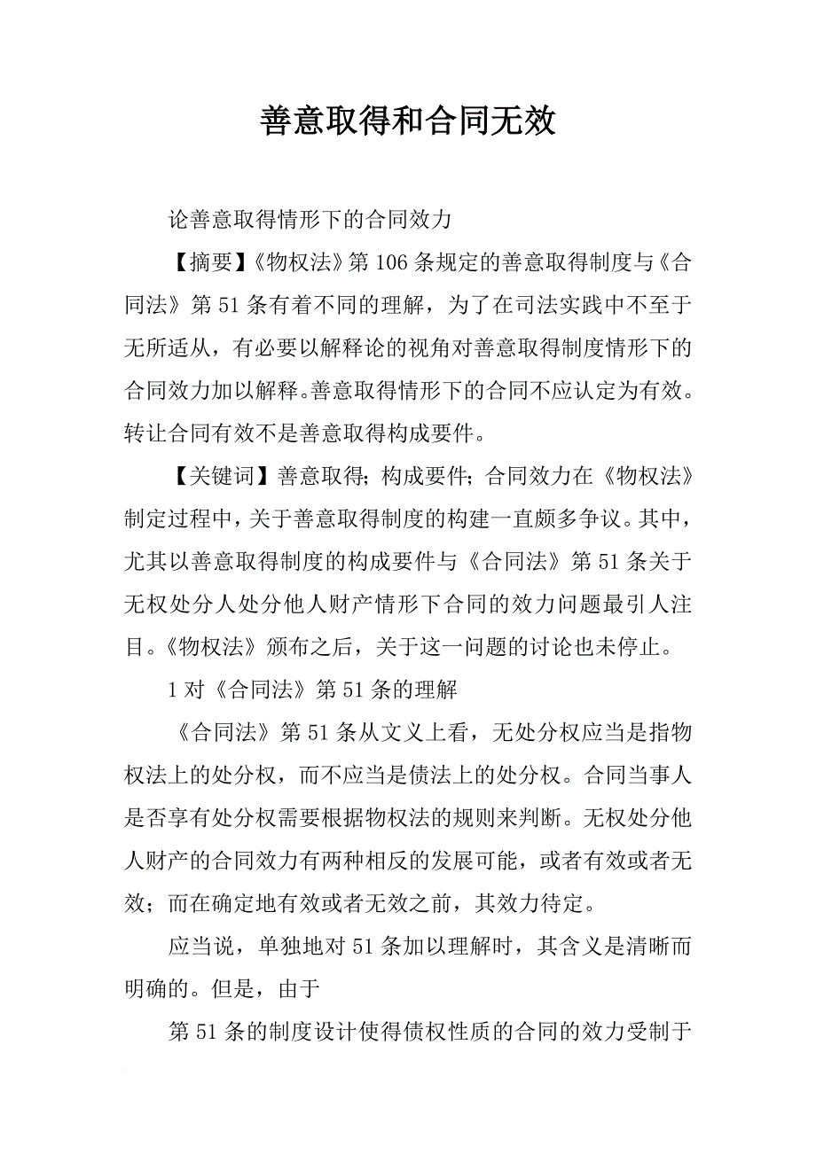 为了适应公司新战略的发展,保障停车场安保新项目的正常、顺利开展,特制定安保从业人员的业务技能及个人素质的培训计划善意取得和合同无效 论善意取得情形下的合同效力 【摘要】《物权法》第106条规定的善意取得制度与《合同法》第51条有着不同的理解,为了在司法实践中不至于无所适从,有必要以解释论的视角对善意取得制度情形下的合同效力加以解释善意取得情形下的合同不应认定为有效转让合同有效不是善意取得构成要件 【关键词】善意取得;构成要件;合同效力在《物权法》制定过程中,关于善意取得制度的构建一直颇多争议其中,尤其以善意取得制度的构成要件与《合同法》第51条关于无权处分人处分他人财产情形下合同的效力问题最引人注目《物权法》颁布之后,关于这一问题的讨论也未停止 1对《合同法》第51条的理解 《合同法》第51条从文义上看,无处分权应当是指物权法上的处分权,而不应当是债法上的处分权合同当事人是否享有处分权需要根据物权法的规则来判断无权处分他人财产的合同效力有两种相反的发展可能,或者有效或者无效;而在确定地有效或者无效之前,其效力待定 应当说,单独地对51条加以理解时,其含义是清晰而明确的但是,由于 第51条的制度设计使得债权性质的合同的效力受制于物权性质的处分权的有无:有处分权①则有效,无处分权则无效。