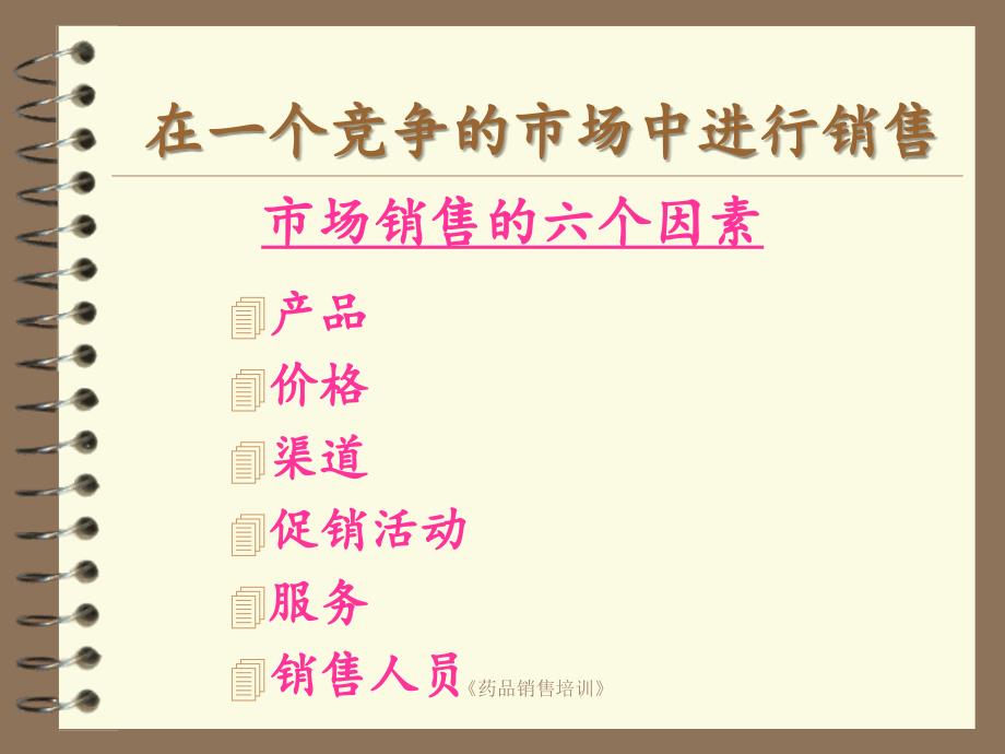 4产品产品4价格价格4渠道渠道4促销活动促销活动4服务服务4销售人员销售人员在一个竞争的市场中进行销售在一个竞争的市场中进行销售市场销售的六个因素市场销售的六个因素《药品销售培训》 销售人员是最重要的因素销售人员是最重要的因素是开启成功大门的钥匙《药品销售培训》 成功销售人员应具备的素质成功销售人员应具备的素质4技巧技巧 1. 1.一对一销售技巧一对一销售技巧 2. 2.团体销售技巧团体销售技巧4知识知识4习惯习惯4态度态度 #1《药品销售培训》制定目标制定目标4长期目标长期目标–代表为负责区域所制定的整体目标代表为负责区域所制定的整体目标4短期目标短期目标–帮助达成长期目标而制定的活动帮助达成长期目标而制定的活动•例如:每个拜访的目标《药品销售培训》有效目标的特征有效目标的特征4现实的现实的4可采取行动的可采取行动的4具体的具体的4有一定时间限制的有一定时间限制的4别人可以协助的别人可以协助的《药品销售培训》 拜访程序拜访程序制定目标制定目标访前计划访前计划销售过程销售过程访后分析访后分析《药品销售培训》《药品销售培训》《药品销售培训》处方过程处方过程集中注意集中注意知识知识决定决定评估评估接受接受取得承诺取得承诺获取反馈获取反馈陈述益处陈述益处确认需求确认需求开场白开场白销售过程销售过程 跟进跟进《药品销售培训》开场的目的4建立融洽的关系 尊敬;同理心;共同基础4建立信任感 知识;自信;诚实正直4表现职业形象《药品销售培训》开场的内容4递名片、自我介绍4说明来意、工作内容4创造氛围4过渡到产品《药品销售培训》开场白的三要素开场白的三要素4寒喧-建立融洽的关系寒喧-建立融洽的关系4理由-拜访的原因理由-拜访的原因4反应-让医生发表意见反应-让医生发表意见《药品销售培训》开场的技巧开场的技巧4眼神、态度眼神、态度4耐心聆听耐心聆听4称赞称赞4提供服务提供服务4关心关心4兴趣话题兴趣话题《药品销售培训》开场的内容开场的内容4递名片、自我介绍递名片、自我介绍4创造氛围创造氛围4说明来意、工作内容说明来意、工作内容4过渡到产品过渡到产品《药品销售培训》初步利益陈述的内容4阐明医患一般需求4阐述解决方法4推出产品名称《药品销售培训》探寻需求探寻需求4适时有效地提出问题适时有效地提出问题4有效倾听和观察技巧有效倾听和观察技巧4随时总结谈话的要点随时总结谈话的要点《药品销售培训》确认需求-客户需求确认需求-客户需求临床的临床的-开药对病人的影响开药对病人的影响–有效性有效性–遵嘱性遵嘱性–安全性安全性–经济性经济性个人的个人的-开药对医生的影响开药对医生的影响–生理生理–安全安全–社会社会–自尊自尊–自我实现自我实现《药品销售培训》 确认需求-确认需求- 提问提问4开放式问题开放式问题4闭合式问题闭合式问题4选择性问题选择性问题《药品销售培训》提问4提问的秘诀:1.有礼貌,但不萎缩2.事前预备好问题3.问题要铺排的有条不紊4.问题要清楚简洁5.如果客户是那些不喜欢回答问题的人,先试着介绍产品资料,然后问一些跟他经验和感受有关的问题6.发问后,让客户有时间作答。