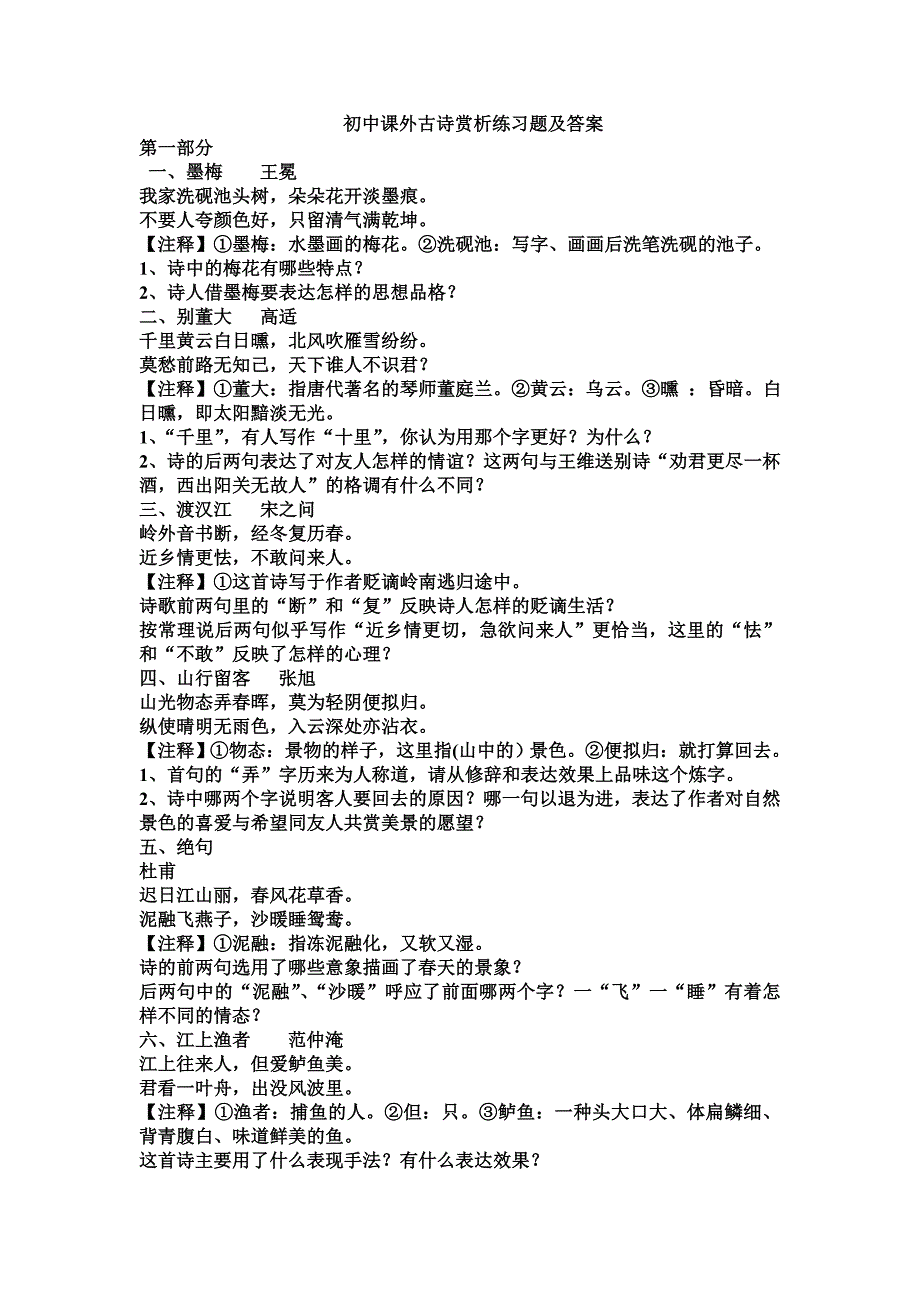 初中课外古诗赏析练习题及答案第一部分 一、墨梅 王冕我家洗砚池头树,朵朵花开淡墨痕不要人夸颜色好,只留清气满乾坤注释】①墨梅:水墨画的梅花②洗砚池:写字、画画后洗笔洗砚的池子 1、诗中的梅花有哪些特点?2、诗人借墨梅要表达怎样的思想品格?二、别董大 高适千里黄云白日曛,北风吹雁雪纷纷莫愁前路无知己,天下谁人不识君?【注释】①董大:指唐代著名的琴师董庭兰②黄云:乌云③曛 :昏暗白日曛,即太阳黯淡无光1、“千里”,有人写作“十里”,你认为用那个字更好?为什么?2、诗的后两句表达了对友人怎样的情谊?这两句与王维送别诗“劝君更尽一杯酒,西出阳关无故人”的格调有什么不同?三、渡汉江 宋之问岭外音书断,经冬复历春近乡情更怯,不敢问来人注释】①这首诗写于作者贬谪岭南逃归途中诗歌前两句里的“断”和“复”反映诗人怎样的贬谪生活?按常理说后两句似乎写作“近乡情更切,急欲问来人”更恰当,这里的“怯”和“不敢”反映了怎样的心理?四、山行留客 张旭山光物态弄春晖,莫为轻阴便拟归纵使晴明无雨色,入云深处亦沾衣注释】①物态:景物的样子,这里指(山中的)景色。