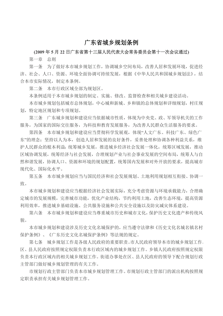 广东省城乡规划条例(2009年5月22日广东省第十三届人民代表大会常务委员会第十一次会议通过) 第一章 总则 第一条 为了做好本市城乡规划工作,协调城乡空间布局,改善人居和发展环境,促进经济、社会、人口、资源、环境全面协调可持续发展,根据《中华人民共和国城乡规划法》,结合本市实际情况,制定本条例 第二条 本市行政区域全部为规划区 本条例适用于本市城乡规划的制定、实施、修改、监督检查和相关城乡建设活动 本市城乡规划包括城市总体规划,中心城和新城、乡和镇的总体规划和详细规划,村庄规划,特定地区规划和专项规划 第三条 广东城乡规划和建设应当依据城市性质,体现为中央党、政、军领导机关的工作服务,为国家的国际交往服务,为科技和教育发展服务,为改善人民群众生活服务的要求 第四条 本市城乡规划和建设应当贯彻科学发展观,体现“人文广东、科技广东、绿色广东”的理念;坚持以人为本,创造人居和发展的良好条件,妥善处理和协调各种利益关系,维护人民群众的根本利益;统筹城乡发展,推进城乡经济社会发展一体化,统筹区域发展,推动区域协调发展,统筹经济与社会发展,合理规划产业与社会事业发展的空间布局,统筹人与自然和谐发展,协调人口、资源和环境的规划配置,统筹国内发展和对外开放的要求,提高城市现代化、国际化水平。