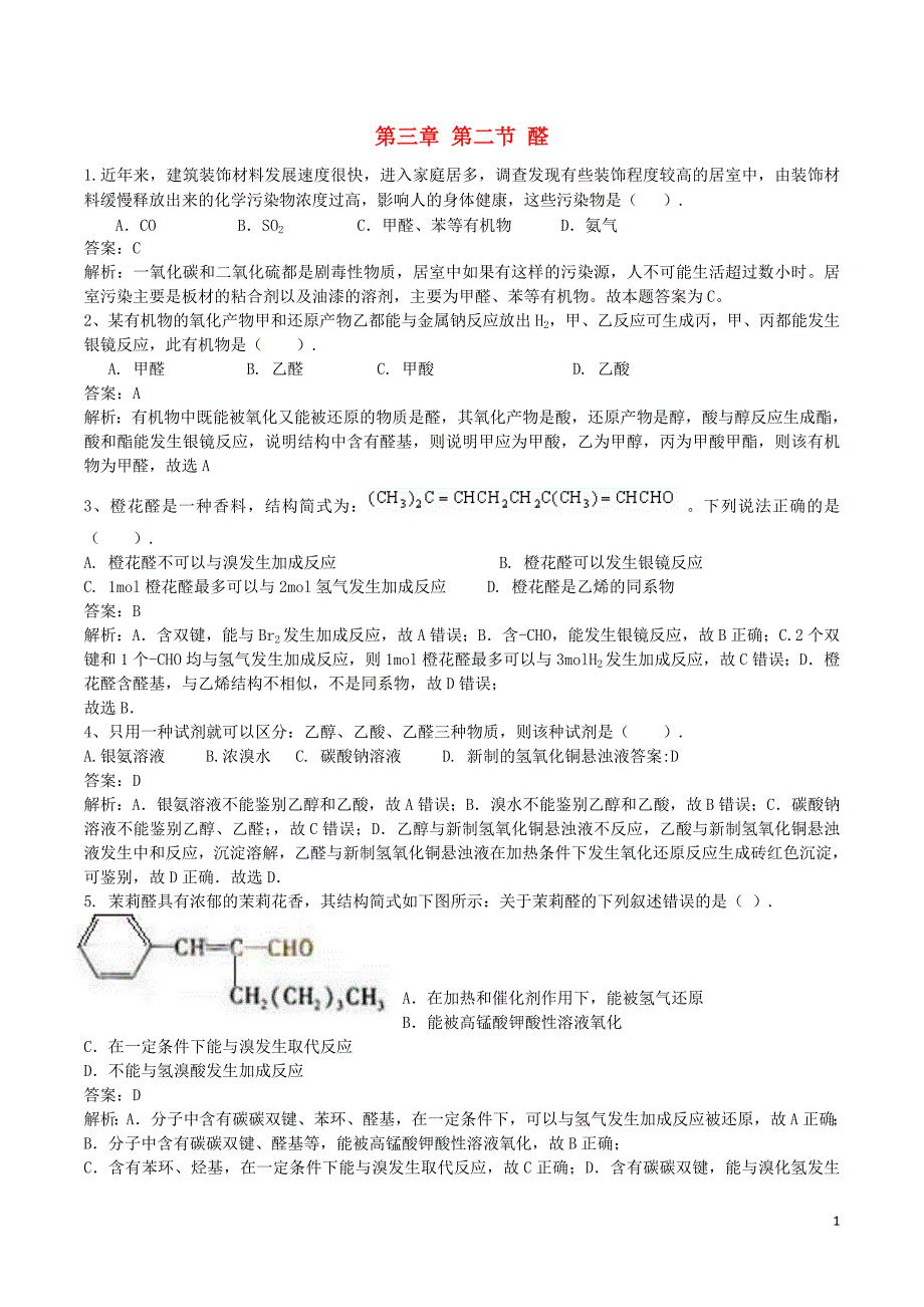 1第三章第三章 第二节第二节 醛醛1.近年来,建筑装饰材料发展速度很快,进入家庭居多,调查发现有些装饰程度较高的居室中,由装饰材料缓慢释放出来的化学污染物浓度过高,影响人的身体健康,这些污染物是( ).A.CO B.SO2 C.甲醛、苯等有机物 D.氨气 答案:C 解析:一氧化碳和二氧化硫都是剧毒性物质,居室中如果有这样的污染源,人不可能生活超过数小时居 室污染主要是板材的粘合剂以及油漆的溶剂,主要为甲醛、苯等有机物故本题答案为 C 2、某有机物的氧化产物甲和还原产物乙都能与金属钠反应放出 H2,甲、乙反应可生成丙,甲、丙都能发 生银镜反应,此有机物是( ). A. 甲醛 B. 乙醛 C. 甲酸 D. 乙酸 答案:A 解析:有机物中既能被氧化又能被还原的物质是醛,其氧化产物是酸,还原产物是醇,酸与醇反应生成酯, 酸和酯能发生银镜反应,说明结构中含有醛基,则说明甲应为甲酸,乙为甲醇,丙为甲酸甲酯,则该有机 物为甲醛,故选 A3、橙花醛是一种香料,结构简式为: 下列说法正确的是( ). A. 橙花醛不可以与溴发生加成反应 B. 橙花醛可以发生银镜反应 C. 1mol 橙花醛最多可以与 2mol 氢气发生加成反应 D. 橙花醛是乙烯的同系物 答案:B 解析:A.含双键,能与 Br2发生加成反应,故 A 错误;B.含-CHO,能发生银镜反应,故 B 正确;C.2 个 双键和 1 个-CHO 均与氢气发生加成反应,则 1 mol 橙花醛最多可以与 3 mol H2发生加成反应,故 C 错误; D.橙花醛含醛基,与乙烯结构不相似,不是同系物,故 D 错误; 故选 B. 4、只用一种试剂就可以区分:乙醇、乙酸、乙醛三种物质,则该种试剂是( ). A.银氨溶液 B.浓溴水 C. 碳酸钠溶液 D. 新制的氢氧化铜悬浊液答案:D 答案:D 解析:A.银氨溶液不能鉴别乙醇和乙酸,故 A 错误;B.溴水不能鉴别乙醇和乙酸,故 B 错误;C.碳酸 钠溶液不能鉴别乙醇、乙醛;,故 C 错误;D.乙醇与新制氢氧化铜悬浊液不反应,乙酸与新制氢氧化铜 悬浊液发生中和反应,沉淀溶解,乙醛与新制氢氧化铜悬浊液在加热条件下发生氧化还原反应生成砖红色 沉淀,可鉴别,故 D 正确.故选 D. 5. 茉莉醛具有浓郁的茉莉花香,其结构简式如下图所示:关于茉莉醛的下列叙述错误的是( ).A.在加热和催化剂作用下,能被氢气还原 B.能被高锰酸钾酸性溶液氧化 C.在一定条件下能与溴发生取代反应 D.不能与氢溴酸发生加成反应 答案:D 解析:A.分子中含有碳碳双键、苯环、醛基,在一定条件下,可以与氢气发生加成反应被还原,故 A 正 确;B.分子中含有碳碳双键、醛基等,能被高锰酸钾酸性溶液氧化,故 B 正确; C.含有苯环、烃基,在一定条件下能与溴发生取代反应,故 C 正确;D.含有碳碳双键,能与溴化氢发生2加成反应,故 D 错误.故选:D. 。