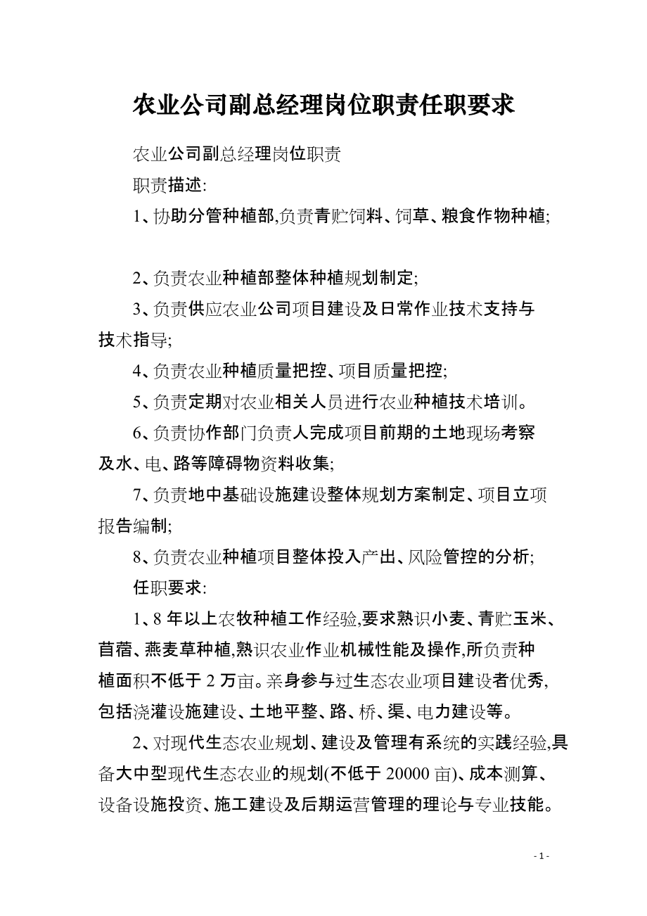 农业公司副总经理岗位职责任职要求 农业公司副总经理岗位职责 职责描述: 1、协助分管种植部,负责青贮饲料、饲草、粮食作物种植; 2、负责农业种植部整体种植规划制定; 3、负责供应农业公司项目建设及日常作业技术支持与技术指导; 4、负责农业种植质量把控、项目质量把控; 5、负责定期对农业相关人员进行农业种植技术培训 6、负责协作部门负责人完成项目前期的土地现场考察及水、电、路等障碍物资料收集; 7、负责地中基础设施建设整体规划方案制定、项目立项报告编制; 8、负责农业种植项目整体投入产出、风险管控的分析; 任职要求: 1、8年以上农牧种植工作经验,要求熟识小麦、青贮玉米、苜蓿、燕麦草种植,熟识农业作业机械性能及操作,所负责种植面积不低于2万亩亲身参与过生态农业项目建设者优秀,包括浇灌设施建设、土地平整、路、桥、渠、电力建设等 2、对现代生态农业规划、建设及管理有系统的实践经验,具备大中型现代生态农业的规划(不低于20000亩)、成本测算、设备设施投资、施工建设及后期运营管理的理论与专业技能。
