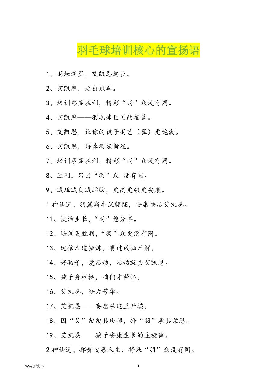 5神仙道、羽动古迹,胜利在握 51、活动助长高,羽翼添饱满 52、让孩子在羽想中生长——艾凯恩 53、“羽”言也是一门艺术——艾凯恩 54、羽中展翅,安康生长 55、学习少儿羽毛球,安康生涯一辈子 56、爱羽毛球,爱活动,爱生涯 57、轻羽飞腾,安康人生 58、“羽”教于乐,康健体格 59、芳华风度,羽我一同翱翔 6神仙道、插上翱翔的同党,铸就安康的体格 3Word版本。