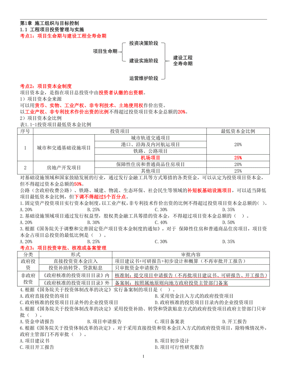 1第1章 施工组织与目标控制1.1 工程项目投资管理与实施第1章 施工组织与目标控制1.1 工程项目投资管理与实施考点1:项目生命期与建设工程全寿命期考点1:项目生命期与建设工程全寿命期考点2:项目资本金制度考点2:项目资本金制度项目资本金,是指在项目总投资中由投资者认缴的出资额投资者认缴的出资额1)项目资本金来源可以用货币、实物、工业产权、非专利技术、土地使用权货币、实物、工业产权、非专利技术、土地使用权作价出资以工业产权、非专利技术作价出资的比例工业产权、非专利技术作价出资的比例不得超过投资项目资本金总额的20%20%2)项目资本金比例表1.1-1投资项目最低资本金比例序号投资项目最低资本金比例1城市和交通基础设施项目城市轨道交通项目20%港口、沿海及内河航运项目铁路、公路项目机场项目机场项目25%25%2房地产开发项目保障性住房和普通商品住房项目20%其他项目25%对基础设施领域和国家鼓励发展的行业,通过发行金融工具等方式筹措的各类资金,可以认定为投资项目资本金,但不得超过资本金总额的50%50%公路(含政府收费公路)、铁路、城建、物流、生态环保、社会民生等领域的补短板基础设施项目补短板基础设施项目,可以适当降低项目最低资本金比例,但下调不得超过5个百分点下调不得超过5个百分点。