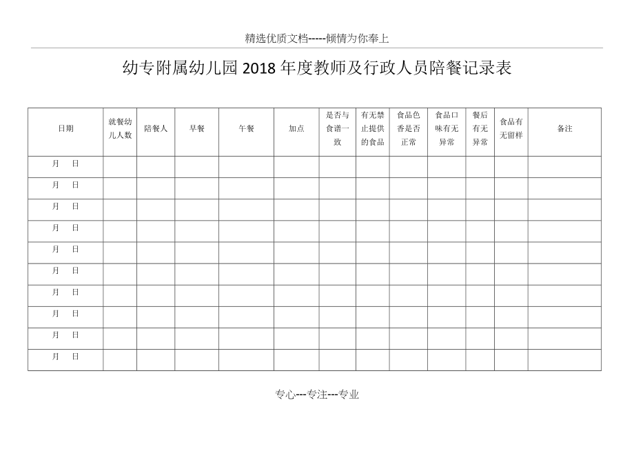 精选优质文档-----倾情为你奉上幼专附属幼儿园2018年度教师及行政人员陪餐记录表 日期就餐幼儿人数陪餐人早餐午餐加点是否与食谱一致有无禁止提供的食品食品色香是否正常食品口味有无异常餐后有无异常食品有无留样备注月 日 月 日 月 日 月 日 月 日 月 日 月 日 月 日 月 日 月 日 月 日 月 日 月 日 月 日 月 日 月 日 月 日 月 日 月 日 月 日 月 日 注:1.陪餐教师由每天行政巡检人员对每天的早餐、午餐、晚点进行陪餐,并填写此表 2.对幼儿园食堂及食品等方面的建议或意见请在备注栏内填写专心---专注---专业。