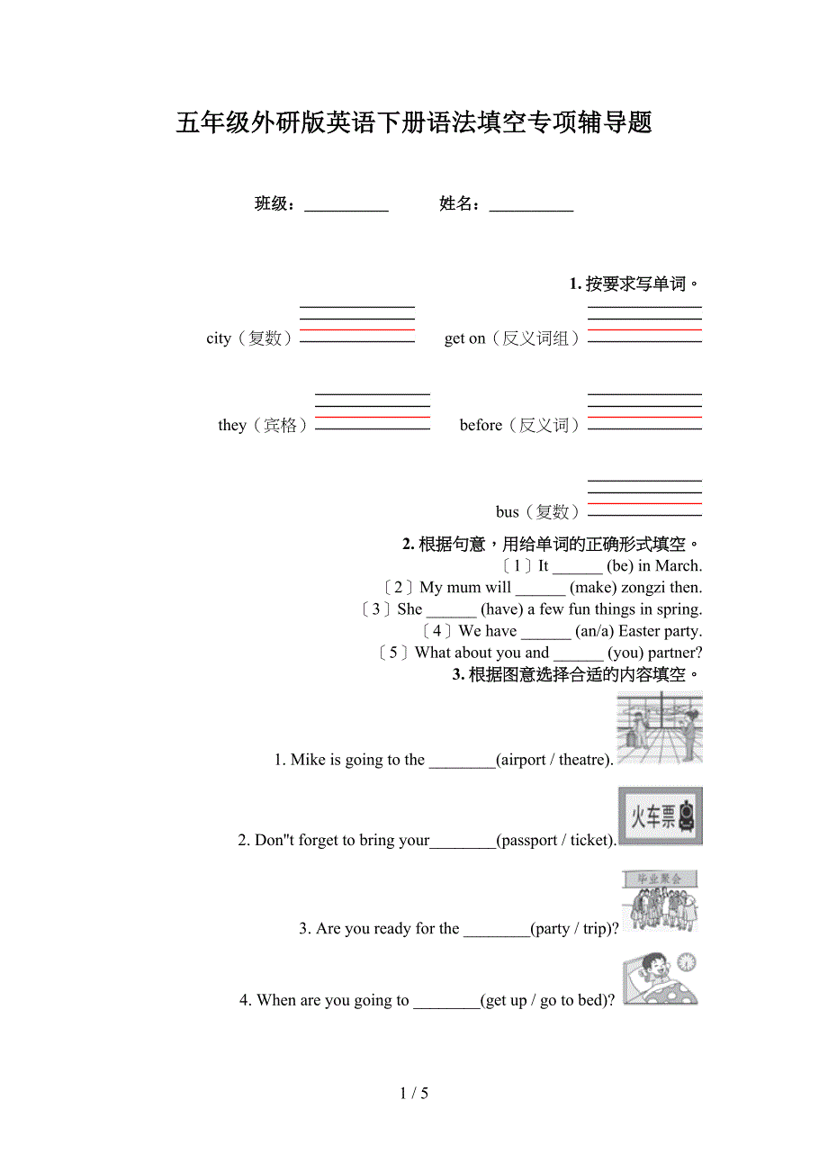 五年级外研版英语下册语法填空专项题班级:__________ 姓名:__________1. 按要求写单词city(复数) get on(反义词组)they(宾格) before(反义词)bus(复数)2. 根据句意,用给单词的正确形式填空[1]It ______ (be) in March.[2]My mum will ______ (make) zongzi then.[3]She ______ (have) a few fun things in spring.[4]We have ______ (an/a) Easter party.[5]What about you and ______ (you) partner?3. 根据图意选择合适的内容填空1. Mike is going to the ________(airport / theatre).2. Don''t forget to bring your________(passport / ticket).3. Are you ready for the ________(party / trip)?4. When are you going to ________(get up / go to bed)?5. That''s a great ________(idea / present).4. 看图完成下列句子。