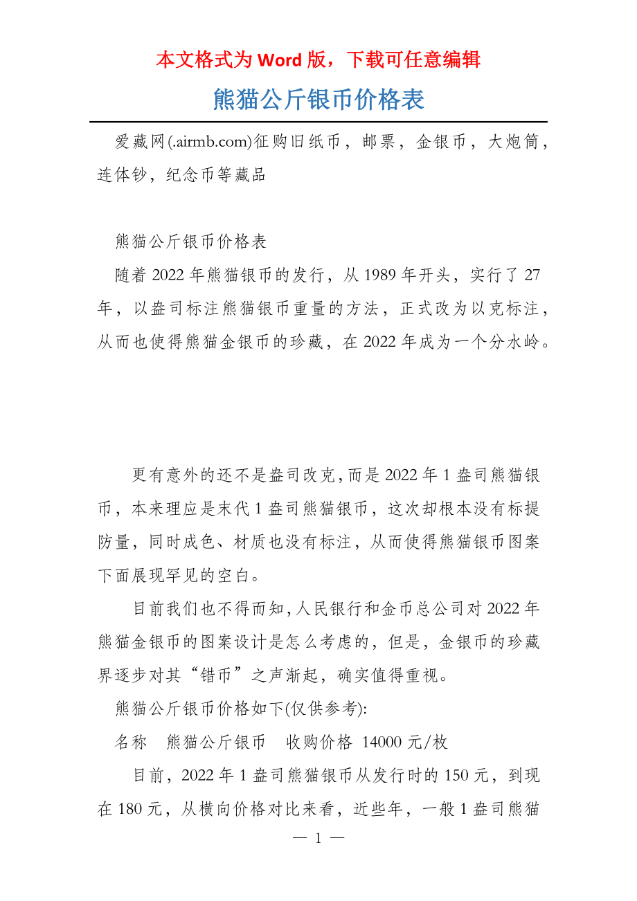 本文格式为Word版,下载可任意编辑熊猫公斤银币价格表 爱藏网()征购旧纸币,邮票,金银币,大炮筒,连体钞,纪念币等藏品 熊猫公斤银币价格表 随着2022年熊猫银币的发行,从1989年开头,实行了27年,以盎司标注熊猫银币重量的方法,正式改为以克标注,从而也使得熊猫金银币的珍藏,在2022年成为一个分水岭 更有意外的还不是盎司改克,而是2022年1盎司熊猫银币,本来理应是末代1盎司熊猫银币,这次却根本没有标提防量,同时成色、材质也没有标注,从而使得熊猫银币图案下面展现罕见的空白 目前我们也不得而知,人民银行和金币总公司对2022年熊猫金银币的图案设计是怎么考虑的,但是,金银币的珍藏界逐步对其“错币”之声渐起,确实值得重视 熊猫公斤银币价格如下(仅供参考): 名称 熊猫公斤银币 收购价格 14000元/枚 目前,2022年1盎司熊猫银币从发行时的150元,到现在180元,从横向价格对比来看,近些年,一般1盎司熊猫发行1年后,价格会涨到220元左右停滞,这样来看,2022年1盎司熊猫银币今年可能会有22%的升幅,这可是超越了全国任何担保公司的付不了本息的理财。