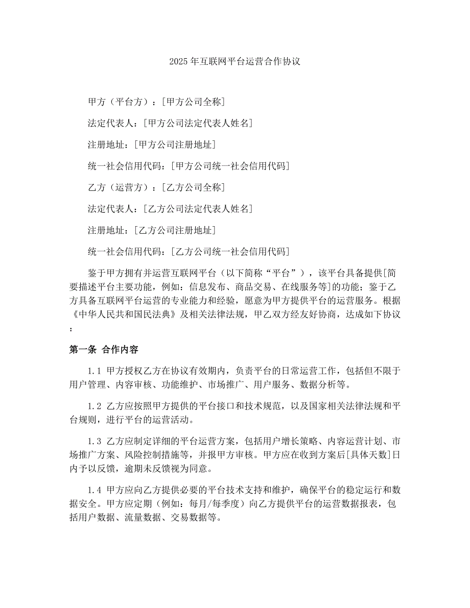 2025年互联网平台运营合作协议甲方(平台方):[甲方公司全称]法定代表人:[甲方公司法定代表人姓名]注册地址:[甲方公司注册地址]统一社会信用代码:[甲方公司统一社会信用代码]乙方(运营方):[乙方公司全称]法定代表人:[乙方公司法定代表人姓名]注册地址:[乙方公司注册地址]统一社会信用代码:[乙方公司统一社会信用代码]鉴于甲方拥有并运营互联网平台(以下简称“平台”),该平台具备提供[简要描述平台主要功能,例如:信息发布、商品交易、服务等]的功能;鉴于乙方具备互联网平台运营的专业能力和经验,愿意为甲方提供平台的运营服务根据《中华人民共和国民法典》及相关法律法规,甲乙双方经友好协商,达成如下协议:第一条 合作内容1.1 甲方授权乙方在协议有效期内,负责平台的日常运营工作,包括但不限于用户管理、内容审核、功能维护、市场推广、用户服务、数据分析等1.2 乙方应按照甲方提供的平台接口和技术规范,以及国家相关法律法规和平台规则,进行平台的运营活动1.3 乙方应制定详细的平台运营方案,包括用户增长策略、内容运营计划、市场推广方案、风险控制措施等,并报甲方审核甲方应在收到方案后[具体天数]日内予以反馈,逾期未反馈视为同意。