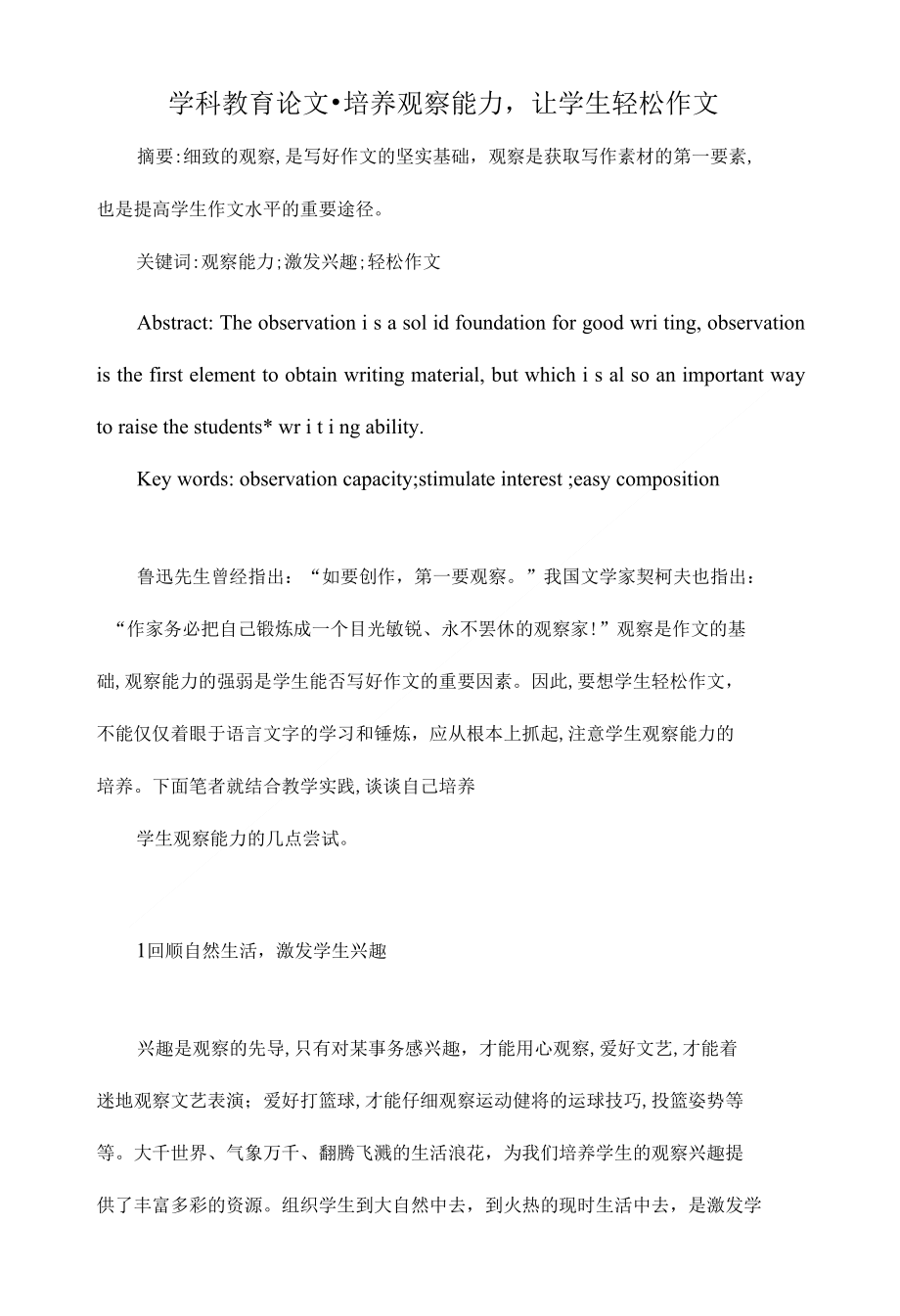 学科教育论文•培养观察能力,让学生轻松作文摘要:细致的观察,是写好作文的坚实基础,观察是获取写作素材的第一要素, 也是提高学生作文水平的重要途径关键词:观察能力;激发兴趣;轻松作文Abstract: The observation i s a sol id foundation for good wri ting, observation is the first element to obtain writing material, but which i s al so an important way to raise the students* wr i t i ng ability.Key words: observation capacity;stimulate interest ;easy composition鲁迅先生曾经指出:“如要创作,第一要观察我国文学家契柯夫也指出:“作家务必把自己锻炼成一个目光敏锐、永不罢休的观察家!”观察是作文的基 础,观察能力的强弱是学生能否写好作文的重要因素因此,要想学生轻松作文, 不能仅仅着眼于语言文字的学习和锤炼,应从根本上抓起,注意学生观察能力的 培养。