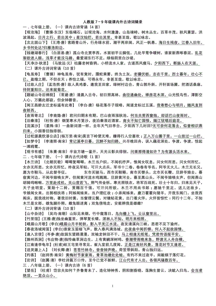 人教版7-9年级课内外古诗词辑录一.七年级上册一)课内古诗背诵(4首)【观沧海】(曹操·东汉)东临碣石,以观沧海水何澹澹,山岛竦峙树木丛生,百草丰茂秋风萧瑟,洪波涌起日月之行,若出其中;星汉灿烂,若出其里幸甚至哉,歌以咏志次北固山下】(王湾·唐)客路青山外,行舟绿水前潮平两岸阔,风正一帆悬海日生残夜,江春入旧年乡书何处达?归雁洛阳边钱塘湖春行】(白居易·唐)孤山寺北贾亭西,水面初平云脚低几处早莺争暖树,谁家新燕啄春泥乱花渐欲迷人眼,浅草才能没马蹄最爱湖东行不足,绿杨阴里白沙堤天净沙·秋思】(马致远·元)枯藤老树昏鸦,小桥流水人家,古道西风瘦马夕阳西下,断肠人在天涯二)课外古诗词背诵(10首)【龟虽寿】(曹操)神龟虽寿,犹有竟时螣蛇乘雾,终为土灰老骥伏枥,志在千里烈士暮年,壮心不已盈缩之期,不但在天;养怡之福,可得永年幸甚至哉,歌以咏志过故人庄】(孟浩然·唐)故人具鸡黍,邀我至田家绿树村边合,青山郭外斜开轩面场圃,把酒话桑麻待到重阳日,还来就菊花题破山寺后禅院】(常建·唐)清晨入古寺,初日照高林曲径通幽处,禅房花木深山光悦鸟性,潭影空人心万籁此都寂,但余钟磬音闻王昌龄左迁龙标遥有此寄】(李白·唐)杨花落尽子规啼,闻道龙标过五溪。