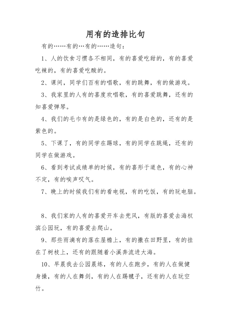 15、那一株株千姿百态的菊花,有的犹如一把撑开的伞,有的活像一扇艳丽动人的凤尾,有的好似一盏盏精致的灯笼 16、公园里的花有的是红色的,有的是黄色的,还有的是白色的 17、花园里的花真美啊,有的含苞欲放,有的还是花骨朵,还有的已经绽放了 18、今天去春游,有的同学带面包,有的带水果,还有的带饮料 19、晴朗的天空中白云朵朵,有的如劈波的帆船,有的如矗立的高楼,还有的如撒欢的牛羊用有的有的仿写排比句 班里有的同学喜爱画画,有的喜爱跳舞,有的喜爱唱歌 课堂休息时,有的同学下飞行棋,有的下围棋,有的下象棋 体育课,有的同学打篮球,有的同学打羽毛球,有的打乒乓球 公园里的,有的人漫步,有的坐着休息,有的赏花 医院里什么病人都有,有的咳嗽,有的感冒,有的发烧 小班小朋友,有的2岁半,有的3岁,有的4岁 运动场上,有的跳高,有的跑步,有的跳远 画画课上,有的画桃花,有的画水仙,有的画菊花 游泳池里,有的蛙泳,有的自由泳,有的仰泳 过年,有许多包,有的是爸爸送的,有的是妈妈送的,有的是叔叔送的,有的是阿姨送的。