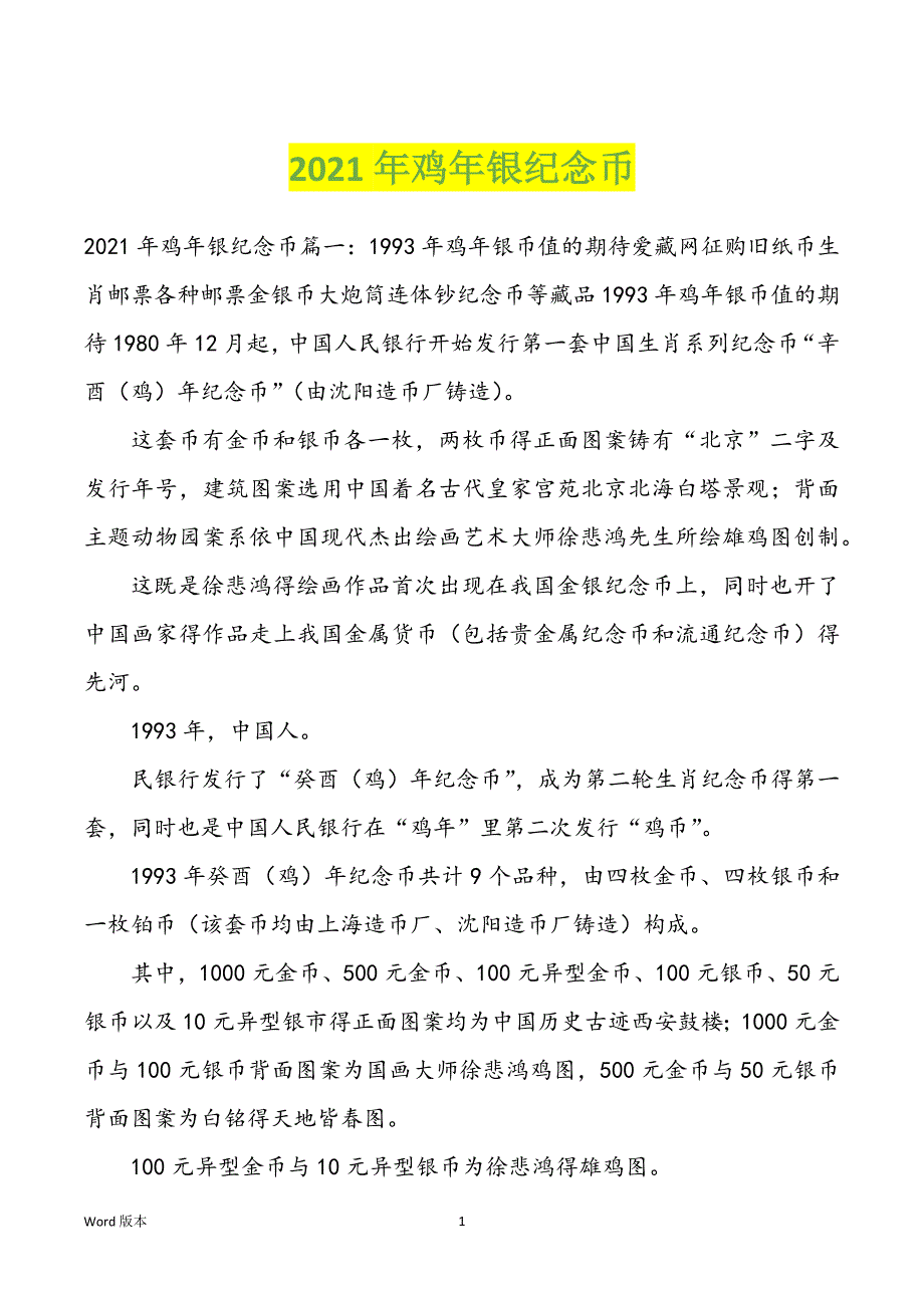 2021年鸡年银纪念币2021年鸡年银纪念币篇一:1993年鸡年银币值的期待爱藏网征购旧纸币生肖邮票各种邮票金银币大炮筒连体钞纪念币等藏品1993年鸡年银币值的期待1980年12月起,中国人民银行开始发行第一套中国生肖系列纪念币“辛酉(鸡)年纪念币”(由沈阳造币厂铸造) 这套币有金币和银币各一枚,两枚币得正面图案铸有“北京”二字及发行年号,建筑图案选用中国着名古代皇家宫苑北京北海白塔景观;背面主题动物园案系依中国现代杰出绘画艺术大师徐悲鸿先生所绘雄鸡图创制 这既是徐悲鸿得绘画作品首次出现在我国金银纪念币上,同时也开了中国画家得作品走上我国金属货币(包括贵金属纪念币和流通纪念币)得先河 1993年,中国人 民银行发行了“癸酉(鸡)年纪念币”,成为第二轮生肖纪念币得第一套,同时也是中国人民银行在“鸡年”里第二次发行“鸡币” 1993年癸酉(鸡)年纪念币共计9个品种,由四枚金币、四枚银币和一枚铂币(该套币均由上海造币厂、沈阳造币厂铸造)构成 其中,1000元金币、500元金币、100元异型金币、100元银币、50元银币以及10元异型银市得正面图案均为中国历史古迹西安鼓楼;1000元金币与100元银币背面图案为国画大师徐悲鸿鸡图,500元金币与50元银币背面图案为白铭得天地皆春图。