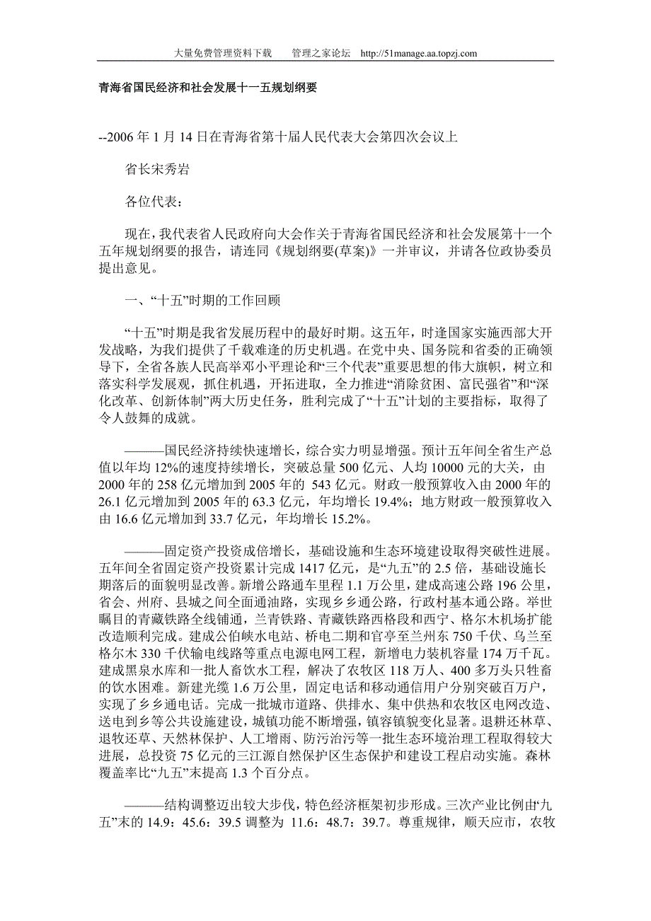 大量免费管理资料下载 管理之家论坛 青海省国民经济和社会发展十一五规划纲要--2006年1月14日在青海省第十届人民代表大会第四次会议上 省长宋秀岩 各位代表: 现在,我代表省人民政府向大会作关于青海省国民经济和社会发展第十一个五年规划纲要的报告,请连同《规划纲要(草案)》一并审议,并请各位政协委员提出意见 一、“十五”时期的工作回顾 “十五”时期是我省发展历程中的最好时期这五年,时逢国家实施西部大开发战略,为我们提供了千载难逢的历史机遇在党中央、国务院和省委的正确领导下,全省各族人民高举邓小平理论和“三个代表”重要思想的伟大旗帜,树立和落实科学发展观,抓住机遇,开拓进取,全力推进“消除贫困、富民强省”和“深化改革、创新体制”两大历史任务,胜利完成了“十五”计划的主要指标,取得了令人鼓舞的成就 ———国民经济持续快速增长,综合实力明显增强预计五年间全省生产总值以年均12%的速度持续增长,突破总量500亿元、人均10000元的大关,由2000年的258亿元增加到2005年的 543亿元财政一般预算收入由2000年的26.1亿元增加到2005年的63.3亿元,年均增长19.4%;地方财政一般预算收入由16.6亿元增加到33.7亿元,年均增长15.2%。