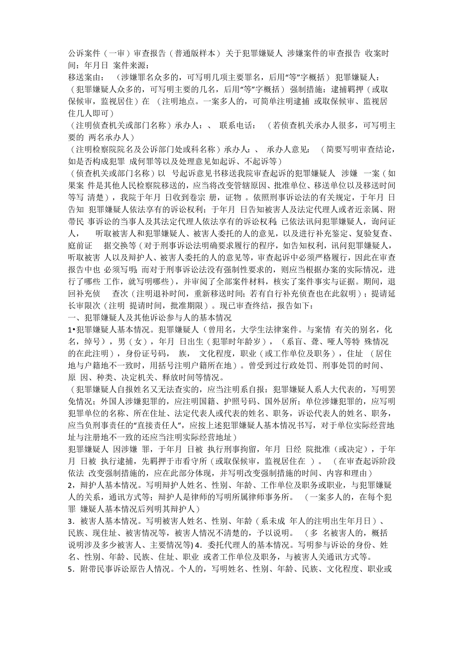 公诉案件(一审)审查报告(普通版样本) 关于犯罪嫌疑人 涉嫌案件的审查报告 收案时间:年月日 案件来源:移送案由: (涉嫌罪名众多的,可写明几项主要罪名,后用“等”字概括) 犯罪嫌疑人: (犯罪嫌疑人众多的,可写明主要的几名,后用“等”字概括) 强制措施:逮捕羁押(或取保候审,监视居住)在 (注明地点一案多人的,可简单注明逮捕 或取保候审、监视居住几人即可)(注明侦查机关或部门名称)承办人:、 联系: (若侦查机关承办人很多,可写明主要的 两名承办人)(注明检察院院名及公诉部门处或科名称)承办人:、 承办人意见: (简要写明审查结论,如是否构成犯罪 成何罪等以及处理意见如起诉、不起诉等)(侦查机关或部门名称)以 号起诉意见书移送我院审查起诉的犯罪嫌疑人 涉嫌 一案(如果案 件是其他人民检察院移送的,应当将改变管辖原因、批准单位、移送单位以及移送时间等写 清楚),我院于年月 日收到卷宗 册,证物 依照刑事诉讼法的有关规定,于年月 日告知 犯罪嫌疑人依法享有的诉讼权利;于年月 日告知被害人及法定代理人或者近亲属、附带民 事诉讼的当事人及其法定代理人依法享有的诉讼权利;已依法讯问犯罪嫌疑人,询问证人, 听取被害人和犯罪嫌疑人、被害人委托的人的意见,以及进行补充鉴定、复验复查、庭前证 据交换等(对于刑事诉讼法明确要求履行的程序,如告知权利,讯问犯罪嫌疑人,听取被害 人以及辩护人、被害人委托的人的意见等,审查起诉中必须严格履行,因此在审查报告中也 必须写明;而对于刑事诉讼法没有强制性要求的,则应当根据办案的实际情况,进行了哪些 工作,就写明哪些),并审阅了全部案件材料,核实了案件事实与证据。