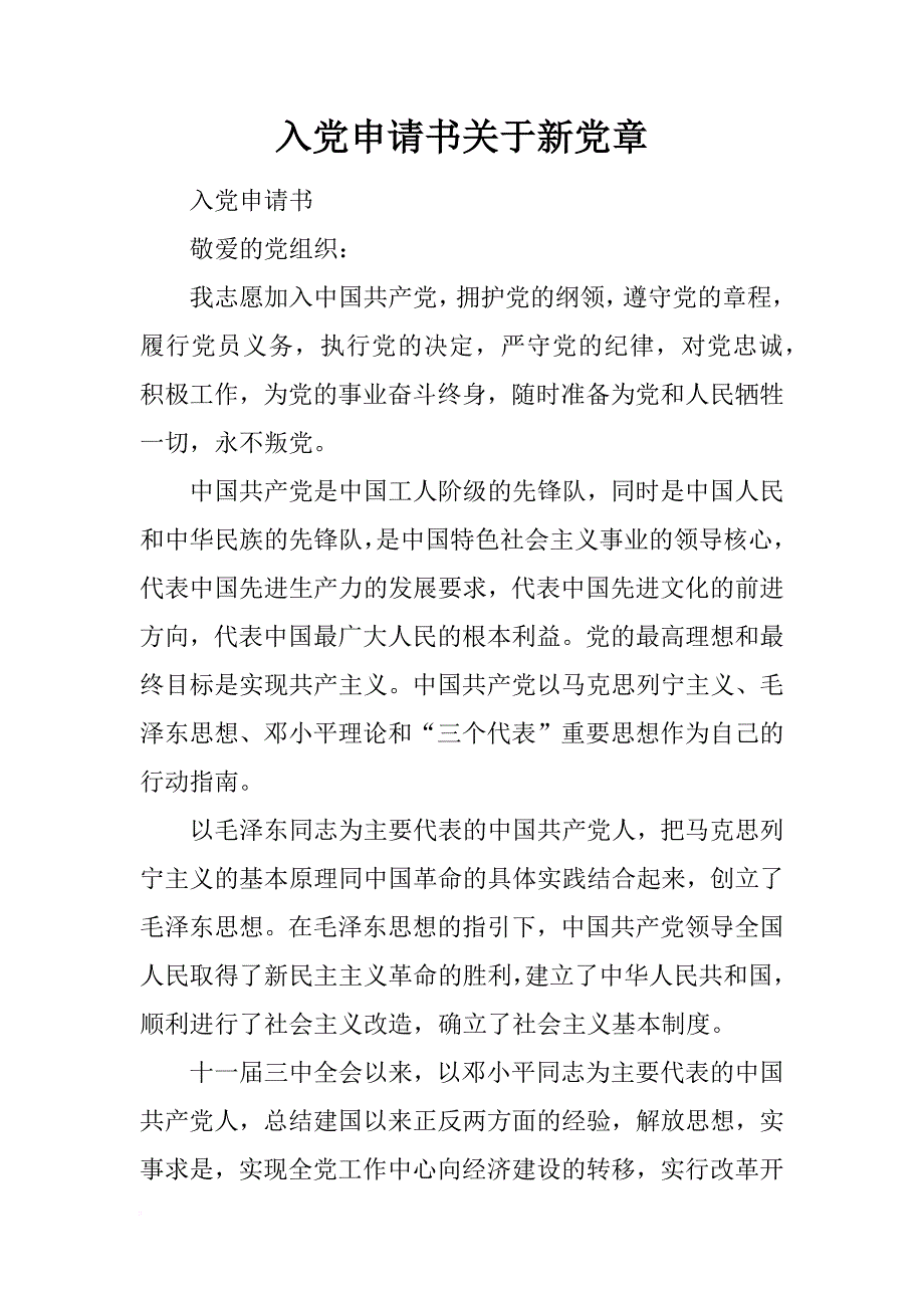 入党申请书关于新党章入党申请书关于新党章入党申请书敬爱的党组织:我志愿加入中国共产党,拥护党的纲领,遵守党的章程,履行党员义务,执行党的决定,严守党的纪律,对党忠诚,积极工作,为党的事业奋斗终身,随时准备为党和人民牺牲一切,永不叛党中国共产党是中国工人阶级的先锋队,同时是中国人民和中华民族的先锋队,是中国特色社会主义事业的领导核心,代表中国先进生产力的发展要求,代表中国先进文化的前进方向,代表中国最广大人民的根本利益党的最高理想和最终目标是实现共产主义中国共产党以马克思列宁主义、毛泽东思想、邓小平理论和“三个代表”重要思想作为自己的行动指南以毛泽东同志为主要代表的中国共产党人,把马克思列宁主义的基本原理同中国革命的具体实践结合起来,创立了毛泽东思想在毛泽东思想的指引下,中国共产党领导全国人民取得了新民主主义革命的胜利,建立了中华人民共和国,顺利进行了社会主义改造,确立了社会主义基本制度十一届三中全会以来,以邓小平同志为主要代表的中国共产党人,总结建国以来正反两方面的经验,解放思想,实事求是,实现全党工作中心向经济建设的转移,实行改革开放,开辟了社会主义事业发展新时期,逐步形成了建设中国特殊社会主义的路线、方针、政策、阐明了在中国建设社会主义、巩固和发展社会主义的基本问题,创立了邓小平理论。
