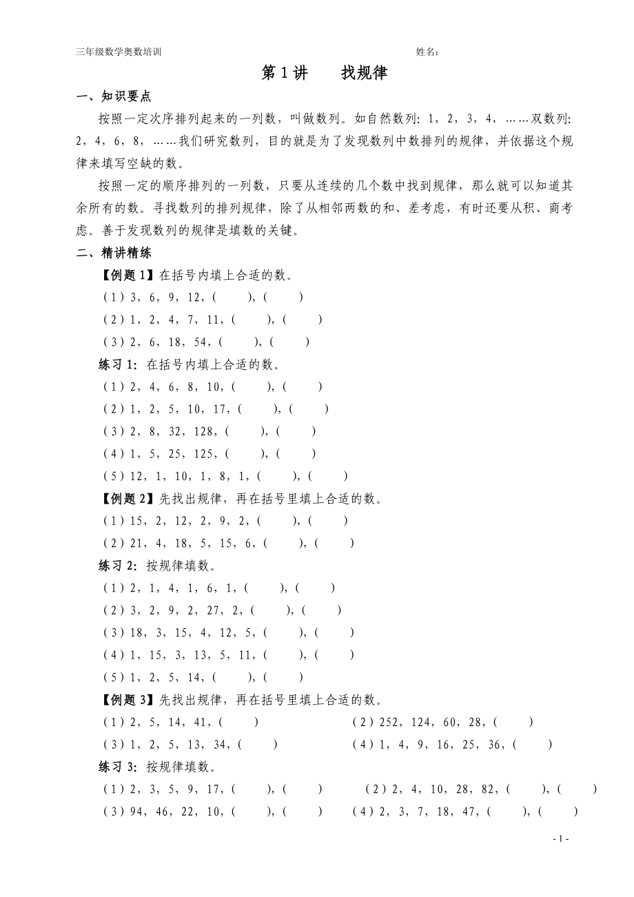 三年级数学奥数培训 姓名:第1讲 找规律一、知识要点按照一定次序排列起来的一列数,叫做数列如自然数列:1,2,3,4,……双数列:2,4,6,8,……我们研究数列,目的就是为了发现数列中数排列的规律,并依据这个规律来填写空缺的数按照一定的顺序排列的一列数,只要从连续的几个数中找到规律,那么就可以知道其余所有的数寻找数列的排列规律,除了从相邻两数的和、差考虑,有时还要从积、商考虑善于发现数列的规律是填数的关键二、精讲精练【例题1】在括号内填上合适的数1)3,6,9,12,( ),( )(2)1,2,4,7,11,( ),( )(3)2,6,18,54,( ),( )练习1:在括号内填上合适的数1)2,4,6,8,10,( ),( )(2)1,2,5,10,17,( ),( )(3)2,8,32,128,( ),( )(4)1,5,25,125,( ),( )(5)12,1,10,1,8,1,( ),( )【例题2】先找出规律,再在括号里填上合适的数。