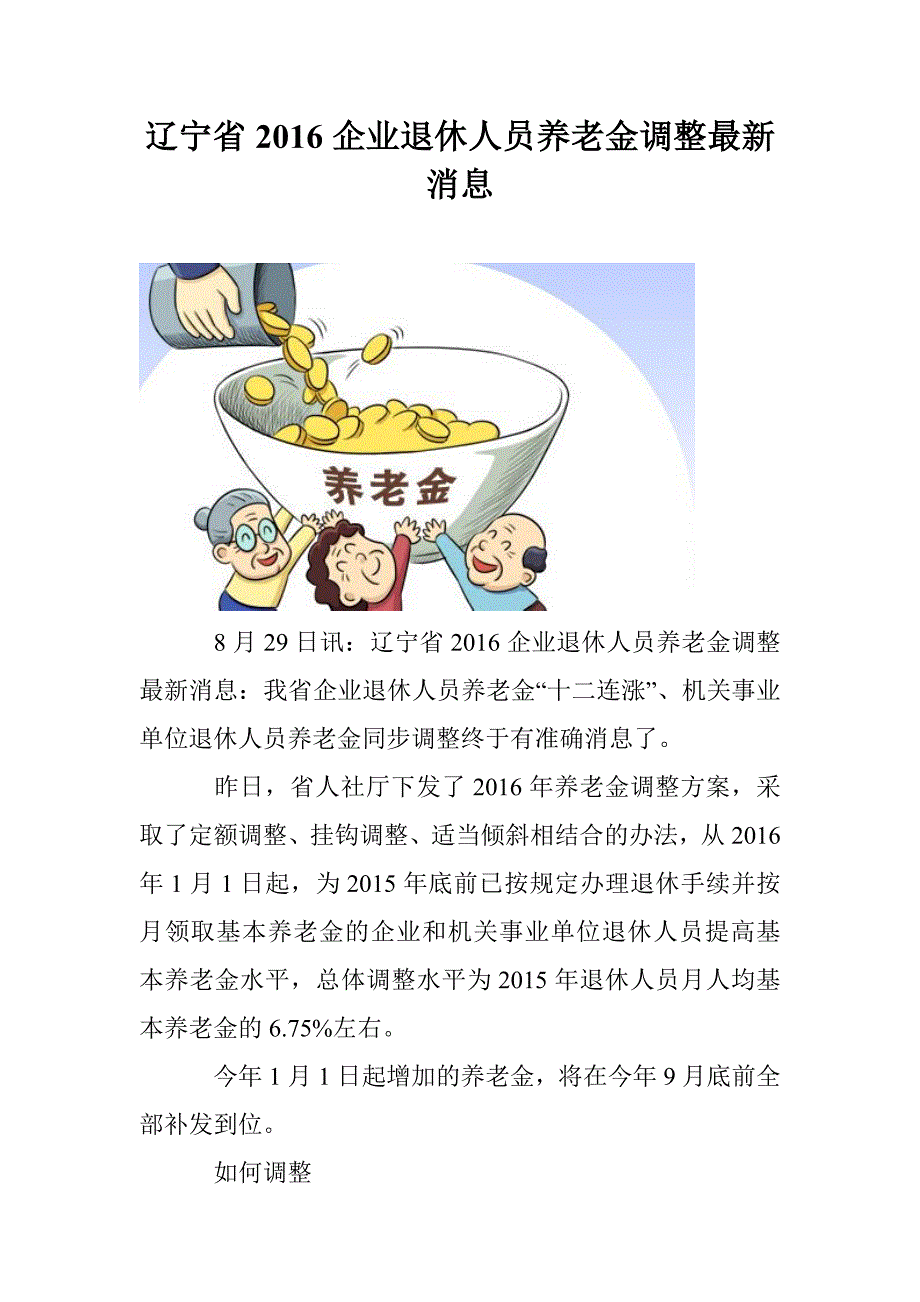 辽宁省2016 企业退休人员养老金调整最新 消息8 月29 日讯:辽宁省2016 企业退休人员养老金调整 最新消息:我省企业退休人员养老金“十二连涨” 、机关事业 单位退休人员养老金同步调整终于有准确消息了昨日,省人社厅下发了2016 年养老金调整方案,采 取了定额调整、挂钩调整、适当倾斜相结合的办法,从 2016 年1 月1 日起,为2015 年底前已按规定办理退休手续 并按月领取基本养老金的企业和机关事业单位退休人员提 高基本养老金水平,总体调整水平为2015 年退休人员月人 均基本养老金的6.75%左右今年1 月1 日起增加的养老金,将在今年9 月底前 全部补发到位如何调整 “见分进元” 缴费年限不足1 年计1 年自去年起,企业养老金调整中就增加了0.5%这一比 例,调整金额将出现分、角零头因此,沈阳市在调整中 采取了“见分进元” 的调整方法也就是说,计算完应涨 129.01 元的,系统都会自动进为130 元整今年这一方法 将继续沿用发放养老金都从统筹基金中支出,有一些特殊人群 补贴项目的资金来自统筹基金之外,与统筹部分的基本养 老金一起发放本次增加0.5%的部分,不包括这类特殊津 贴。