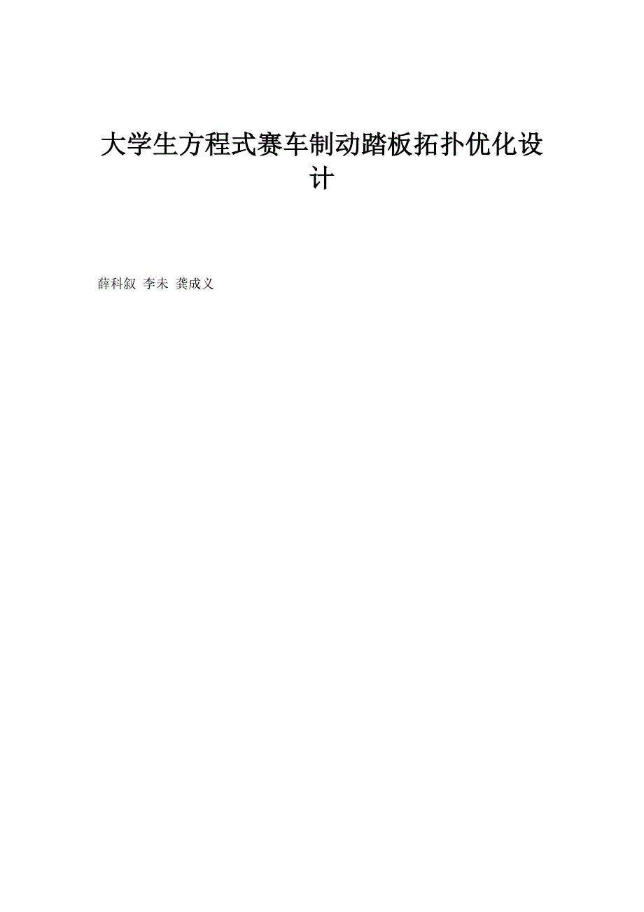 大学生方程式赛车制动踏板拓扑优化设计 薛科叙 李未 龚成义摘 要:为了更好实现赛车的轻量化设计目标,针对制动踏板,利用拓扑优化的方法对制动踏板进行结构优化并重建模型,并与原始制动踏板做强度分析与疲劳分析的结果对比结果表明,拓扑优化设计后的制动踏板,其变形量、应力分布均好于原始制动踏板,并且质量降低了22.1%,实现了轻量化设计目标,对赛车零部件设计思路具有一定的指导作用关键词:拓扑优化;轻量化;制动踏板:U469.6+96 :A :1671-7988(2020)09-138-03The Topological Optimization Design of the Brake Pedal of theFormula SAEXueKexu, LiWei*, GongChengyi(College of mechanical and vehicle engineering, Changchun University, JilinChangchun130022)Abstract:In order to achieve the lightweight design goal of racing car better, For the brake pedal, the topological optimization method is used to optimize the structure of the brake pedal, then rebuild the model. At the meanwhile, the results of strength analysis and fatigue analysis are compared with the original brake pedal. The result shows that the deformation and stress distribution of the brake after topology optimization design are better than that of the original brake pedal, and the quality is reduced by 22.1%, achieving the goal of lightweight design. The paper has a certain guiding effect on the design of racing car parts.Keywords: Topology optimization;Lightweight;Brake pedalCLC NO.: U469.6+96 Document Code: A Article ID:1671-7988(2020)09-138-031 前言中國大学生方程式汽车大赛(简称“中国FSC”)是一项由高等院校汽车工程或汽车相关专业在校学生组队参加的汽车设计与制造比赛。