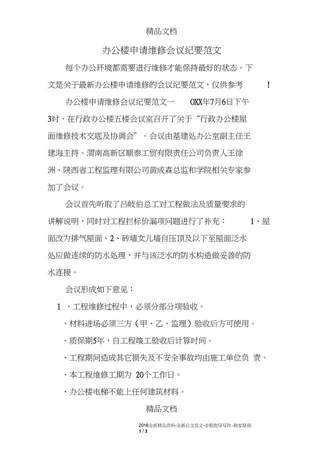 文是关于最新办公楼申请维修的会议纪要范文,仅供参考 !