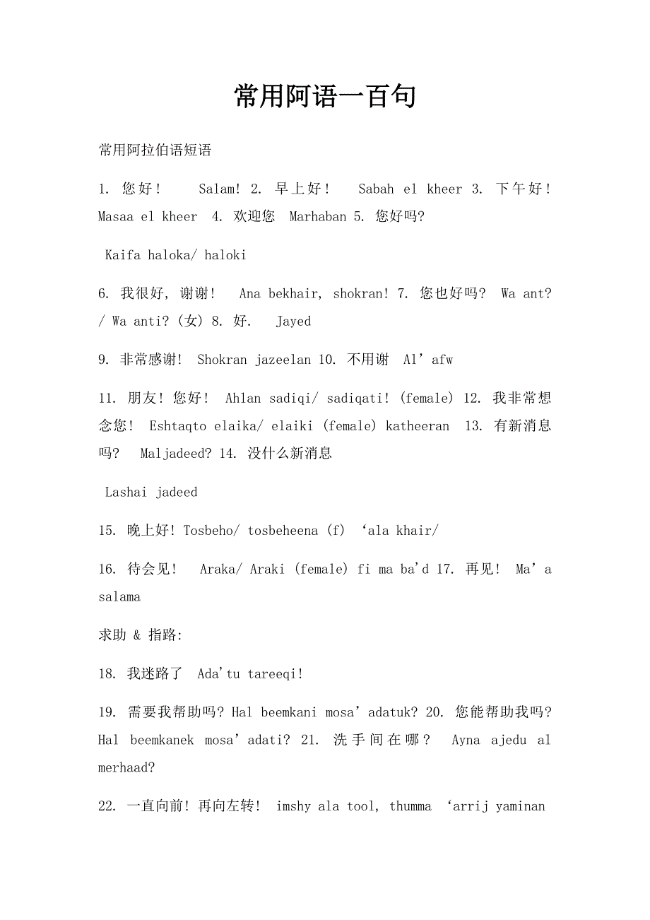 常用阿语一百句常用阿拉伯语短语 1. 您好! Salam! 2. 早上好! Sabah el kheer 3. 下午好! Masaa el kheer 4. 欢迎您 Marhaban 5. 您好吗? Kaifa haloka/ haloki 6. 我很好, 谢谢! Ana bekhair, shokran! 7. 您也好吗? Wa ant? / Wa anti? (女) 8. 好. Jayed 9. 非常感谢! Shokran jazeelan 10. 不用谢 Al’afw 11. 朋友! 您好! Ahlan sadiqi/ sadiqati! (female) 12. 我非常想念您! Eshtaqto elaika/ elaiki (female) katheeran 13. 有新消息吗? Maljadeed? 14. 没什么新消息 Lashai jadeed 15. 晚上好! Tosbeho/ tosbeheena (f) ‘ala khair/ 16. 待会见! Araka/ Araki (female) fi ma ba'd 17. 再见! Ma’a salama 求助 & 指路: 18. 我迷路了 Ada'tu tareeqi! 19. 需要我帮助吗? Hal beemkani mosa’adatuk? 20. 您能帮助我吗? Hal beemkanek mosa’adati? 21. 洗手间在哪? Ayna ajedu al merhaad? 22. 一直向前! 再向左转! imshy ala tool, thumma ‘arrij yaminan 23. 我找JOHN. Abhatu ‘an John 24. 请稍候! Lahda men fadlek/ fadleki (female) 25. 请稍等! () ibqa ala al khat raja'an 26. 这个多少钱? Kam howa thamanoh? 27. 劳驾! ( 请人帮忙) Men fathlek/ fathleki 28. 麻烦您让个道 Alma'derah! 29. 请跟我走! Ta'ala/ ta'alay (female) ma'ee! 30. 您说英语吗? Hal tatakallamu alloghah alenjleziah? 31. 会说一点. Qaleelan! 32. 您的尊名是? Ma esmouk? Ma esmouki? 33. 我叫 …. Esmee… 34. …先生..…女士/ …小姐 Assayed…/ Assayeda…/ Al anesah ... 35. 见到您很高兴! Motasharefon/ motasharefatun (f) bema'refatek 36. 您太好啦! Anta lateef/ Anti lateefa 37. 您是那里人? Men ayna anta/ anti (female)? 38. 我是美国人 Ana men amreeka 39. 您住哪? Ayna taskun?/ Ayna taskuneen? (female) 40. 我住在法国 A'eesho fel welayat faransa 41. 您喜欢这儿吗? Hal istamta'ta bewaqtika/ bewaqtiki (f) huna? 42. 摩纳哥是个美丽的国家 Al maghrib baladun jameel! 43. 您的职业是? Ma mehnatuk? Mehnatuki (female) 44. 我是翻译工作者 A'mal ka motarjim 45. 我喜欢阿拉伯语 Ohibbu allughah al arabia 46. 我学阿拉伯语一个月了 adrusu allughah al arabia mundu shahr 47. 那很好! Hada shay'un Jameel 48. 您多大了? Kam howa umruk? umroki (female) 49. 我二十岁/三十岁了. Umri ( 'eshreen/ thalatheen) sanah (th as in bath) 50. 我要走了 Yajebu an athhaba al aan! 51. 我马上就回来! Sa arje’o halan 其他: 52. 祝您好运 Bettawfeeq! 53. 生日快乐 Eid meelad sa’eed! 54. 新年快乐 sana sa’eedah! 55. 圣诞节快乐 a’yaad meelad saeedah 56. 节日吉庆 eid mobarak! 57. 斋月吉庆 Ramadan mobarak! 58. 恭喜 Mabrook! 59. 请用[筵席] Shahia tayebah! 60. 我想访问摩纳哥 Arghabu bezeyarat al maghrib. 61. 代向JOHN问候 Sallem ‘ala John men ajlee. 62. 祝福您[打嚏喷时] Rahimaka Allah 63. 晚安_做个好梦 Laila sa’eda wa ahlaam ladida 64. 请再说一遍好吗 ‘afwan! 65. 对不起 Aasef 66. 没问题 la moshkelah 67. 请再说一遍 a’ed men fadlek 68. 请说慢点儿 Takalam bebot’ men fadlek 69. 请写下来 70. 我不懂 71. 我不知道 Oktobha men fadlek La afham! La a’ref! 72. 我不清楚 La adri! 73. 这个阿拉伯语怎么说 Ma esmoho bel arabiah? 74. 这是什么? Ma hatha? 75. 别担心 La taqlaq 76. 好/坏/一般 yayed / saye’ / ‘adee 77. 大/小 kabeer / sagheer 78. 今天/现在 79. 明天/昨天 80. 是/不是 alyawm / al aan ghadan / albareha na’am / laa 81. 拿着 khod 82. 您喜欢这个吗? Hal a’jabak? 83. 我真的很喜欢这个! A’jabani haan! 84. 我饿了/渴了 85. 上午/下午/晚上 /hunaak 87. 我/你/妳/他/她 hiya 88. 真的 89. 看 90. 快点 haan onzor asre’ Matha? Ayn? Kam essa’a enaha al’ashera a’teni hatheh! wahed, ithnaan, thalatha ana jae’ / ana atshaan sabahan / masa’an / laylan 86. 这个/那个/这儿/那儿 hatha / thalek /huna ana / anta / anti / houwa / 91. 什么? / 哪儿? 92. 现在几点了? 93. 现在十点钟 94. 给我这个 95. 一、二、三 96. 四、五、六 araba’a, khamsa, sitta 97. 七、八、九、十 sab’a, thamania, tis’a, ‘ashara 。