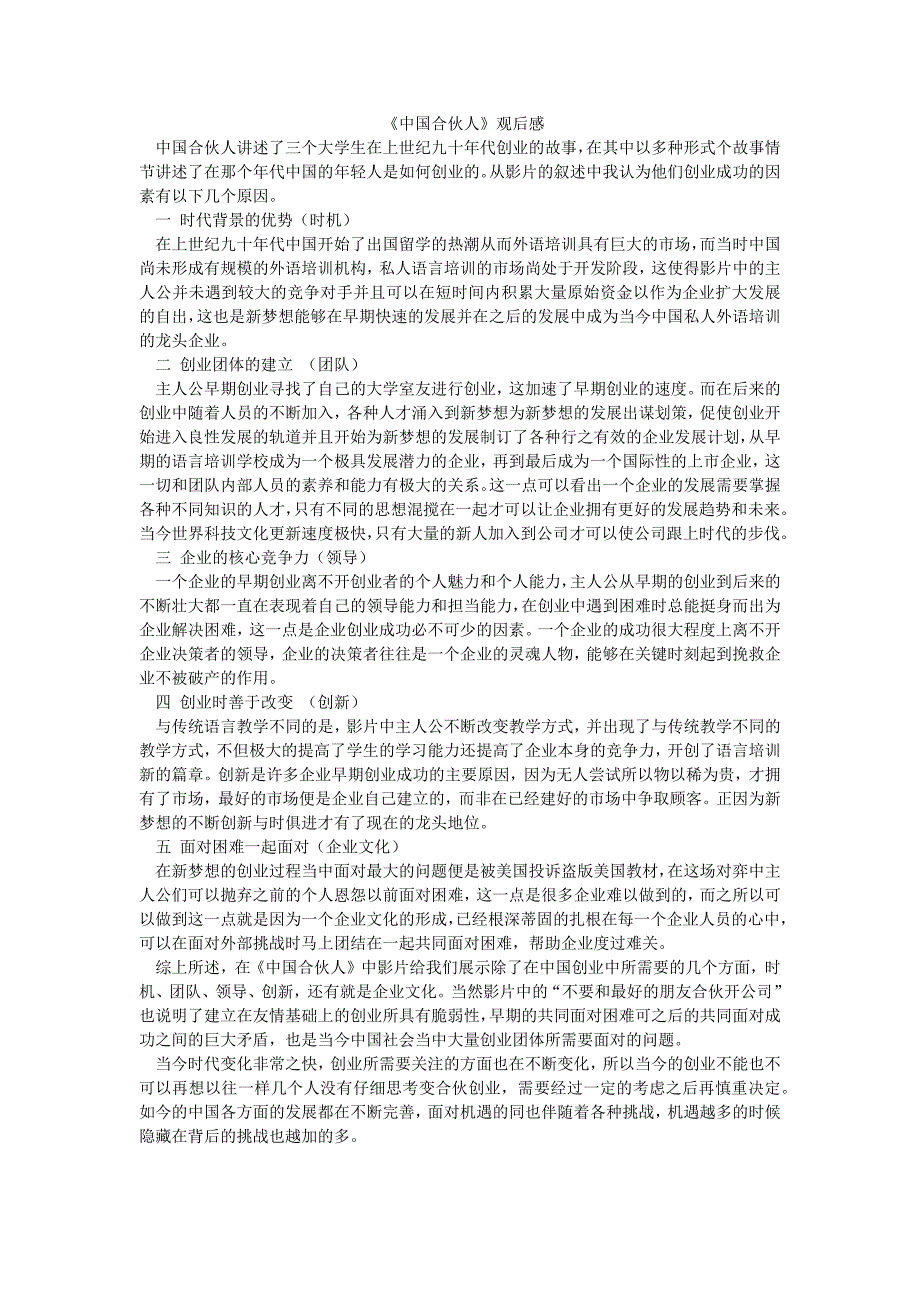 《中国合伙人》观后感 中国合伙人讲述了三个大学生在上世纪九十年代创业的故事,在其中以多种形式个故事情节讲述了在那个年代中国的年轻人是如何创业的从影片的叙述中我认为他们创业成功的因素有以下几个原因 一 时代背景的优势(时机) 在上世纪九十年代中国开始了出国留学的热潮从而外语培训具有巨大的市场,而当时中国尚未形成有规模的外语培训机构,私人语言培训的市场尚处于开发阶段,这使得影片中的主人公并未遇到较大的竞争对手并且可以在短时间内积累大量原始资金以作为企业扩大发展的自出,这也是新梦想能够在早期快速的发展并在之后的发展中成为当今中国私人外语培训的龙头企业 二 创业团体的建立 (团队) 主人公早期创业寻找了自己的大学室友进行创业,这加速了早期创业的速度而在后来的创业中随着人员的不断加入,各种人才涌入到新梦想为新梦想的发展出谋划策,促使创业开始进入良性发展的轨道并且开始为新梦想的发展制订了各种行之有效的企业发展计划,从早期的语言培训学校成为一个极具发展潜力的企业,再到最后成为一个国际性的上市企业,这一切和团队内部人员的素养和能力有极大的关系。