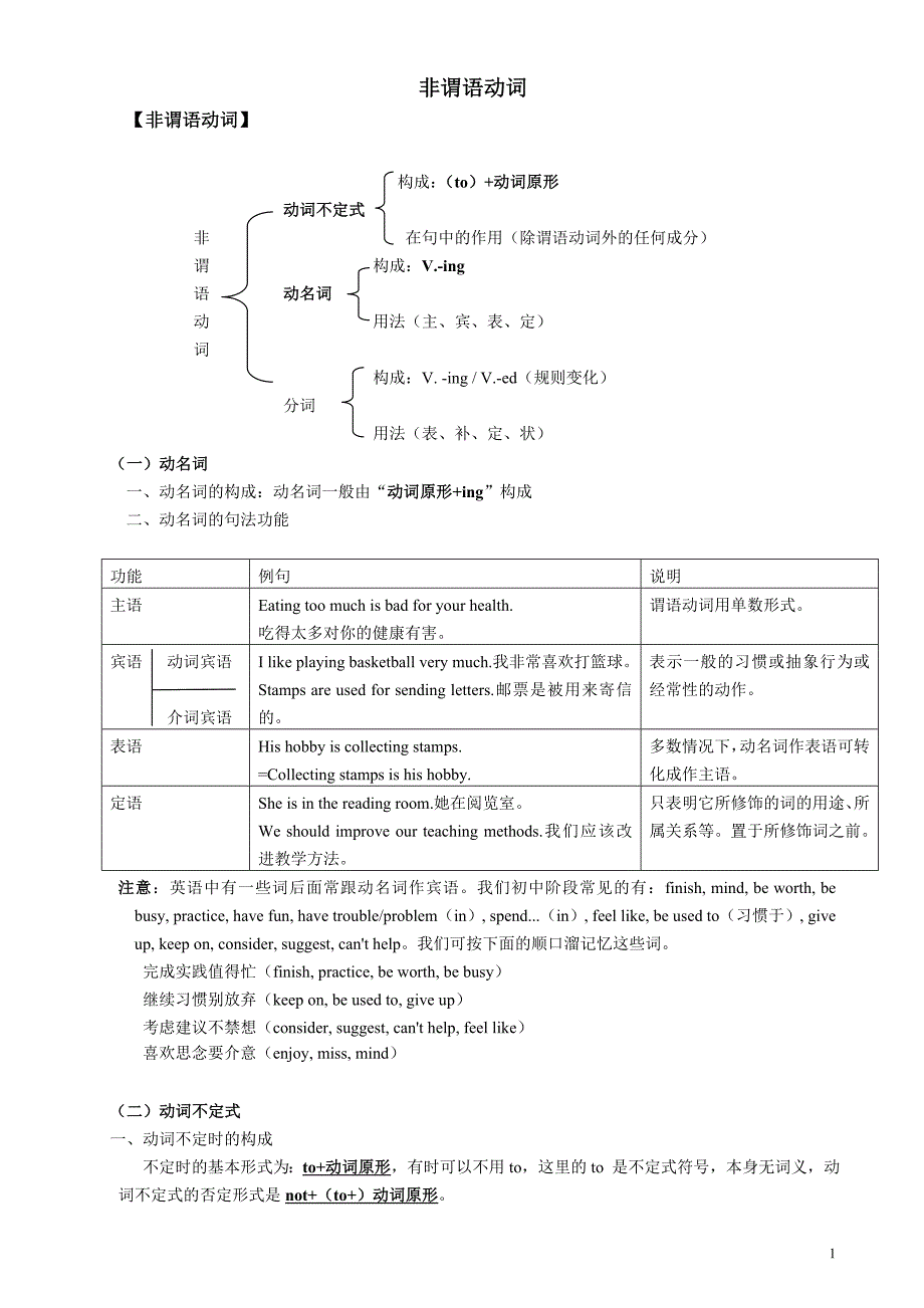 表示一般的习惯或抽象行为或经常性的动作表语His hobby is collecting stamps.=Collecting stamps is his hobby.多数情况下,动名词作表语可转化成作主语定语She is in the reading room.她在阅览室We should improve our teaching methods.我们应该改进教学方法只表明它所修饰的词的用途、所属关系等置于所修饰词之前注意:英语中有一些词后面常跟动名词作宾语我们初中阶段常见的有:finish, mind, be worth, be busy, practice, have fun, have trouble/problem(in), spend...(in), feel like, be used to(习惯于), give up, keep on, consider, suggest, can't help我们可按下面的顺口溜记忆这些词 完成实践值得忙(finish, practice, be worth, be busy) 继续习惯别放弃(keep on, be used to, give up) 考虑建议不禁想(consider, suggest, can't help, feel like)喜欢思念要介意(enjoy, miss, mind)(二)动词不定式一、 动词不定时的构成不定时的基本形式为:to+动词原形,有时可以不用to,这里的to 是不定式符号,本身无词义,动词不定式的否定形式是not+(to+)动词原形。