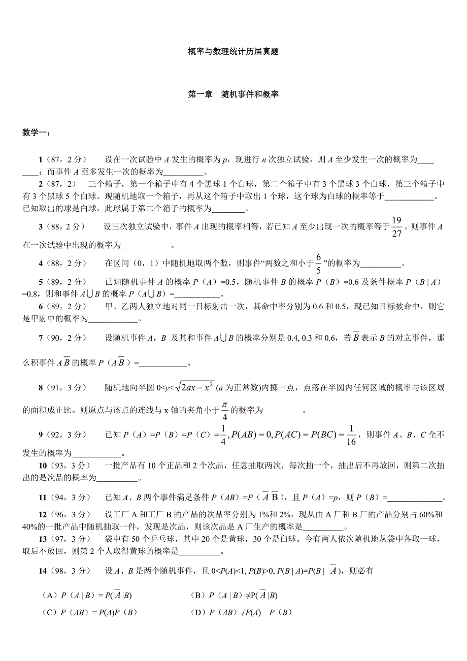 概率与数理统计历届真题第一章 随机事件和概率数学一:1(87,2分) 设在一次试验中A发生的概率为p,现进行n次独立试验,则A至少发生一次的概率为 ;而事件A至多发生一次的概率为 2(87,2) 三个箱子,第一个箱子中有4个黑球1个白球,第二个箱子中有3个黑球3个白球,第三个箱子中有3个黑球5个白球现随机地取一个箱子,再从这个箱子中取出1个球,这个球为白球的概率等于 已知取出的球是白球,此球属于第二个箱子的概率为 3(88,2分) 设三次独立试验中,事件A出现的概率相等,若已知A至少出现一次的概率等于,则事件A在一次试验中出现的概率为 4(88,2分) 在区间(0,1)中随机地取两个数,则事件“两数之和小于”的概率为 5(89,2分) 已知随机事件A的概率P(A)=0.5,随机事件B的概率P(B)=0.6及条件概率P(B | A)=0.8,则和事件AB的概率P(AB)= 6(89,2分) 甲、乙两人独立地对同一目标射击一次,其命中率分别为0.6和0.5,现已知目标被命中,则它是甲射中的概率为 7(90,2分) 设随机事件A,B 及其和事件AB的概率分别是0.4, 0.3和0.6,若表示B的对立事件,那么积事件A的概率P(A)= 。