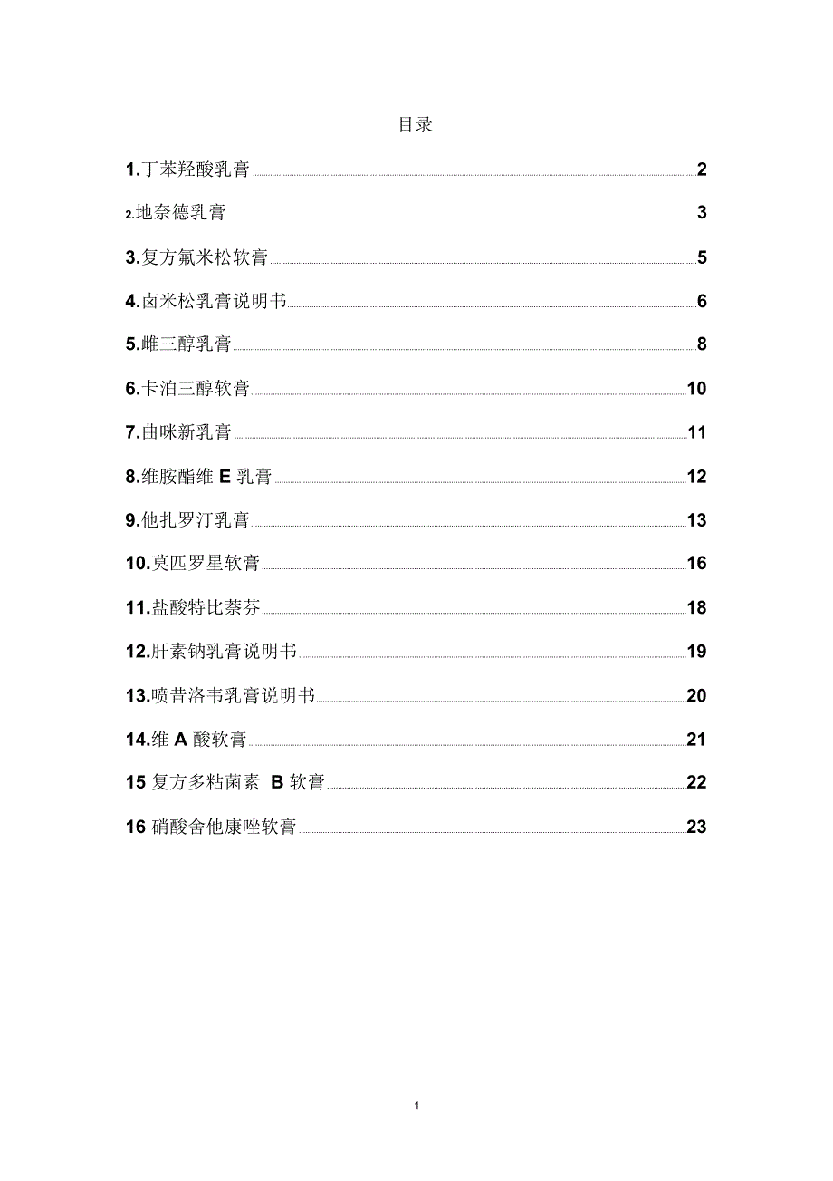 目录1.丁苯羟酸乳膏 22.地奈德乳膏 33.复方氟米松软膏 54.卤米松乳膏说明书 65.雌三醇乳膏 86.卡泊三醇软膏 107.曲咪新乳膏 118.维胺酯维 E 乳膏 129.他扎罗汀乳膏 1310.莫匹罗星软膏 1611.盐酸特比萘芬 1812.肝素钠乳膏说明书 1913.喷昔洛韦乳膏说明书 2014.维 A 酸软膏 2115 复方多粘菌素 B 软膏 2216 硝酸舍他康唑软膏 231丁苯羟酸乳膏其化学名: 4-丁氧基- N-羟基苯乙酰胺结构式】【性状】本品为白色乳膏药理、毒理】本品为非甾体抗炎药物 局部皮肤外用对角叉菜胶致大鼠足趾肿胀和二甲苯致小鼠耳廓肿胀具有抑制作用药代动力学】 皮肤局部使用后进 入体循环的药物很少 ,在局部皮肤组织可达到较高药物浓度适应症】本品适用于 湿疹、神经性皮炎 用法与用量】本品适量涂于患处, 每日 2~4 次;或遵医嘱不良反应】(1)过敏反应,表现为局部发红、丘疹、水肿、肿胀、小水疱等2)有局部刺激作用, 长期使用,可有皮肤色素沉着 禁忌症】对本品过敏者禁用注意事项】( 1)发生过敏反应立即停药 2)本品不能用于眼科 3)药品性状发生改变时禁用 4)儿童必须在成人监护下使用。