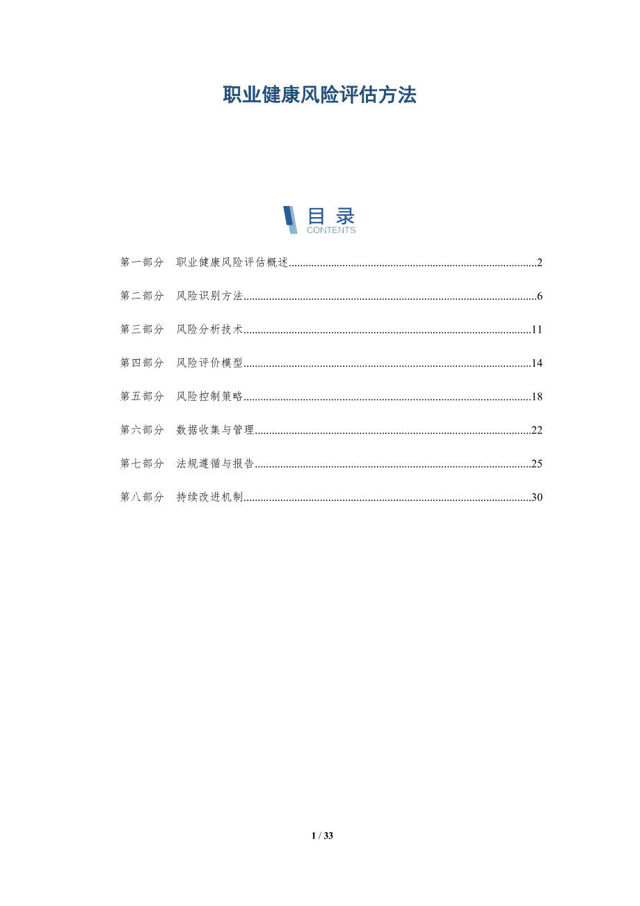 职业健康风险评估方法 第一部分 职业健康风险评估概述 2第二部分 风险识别方法 6第三部分 风险分析技术 11第四部分 风险评价模型 14第五部分 风险控制策略 18第六部分 数据收集与管理 22第七部分 法规遵循与报告 25第八部分 持续改进机制 30第一部分 职业健康风险评估概述关键词关键要点职业健康风险评估概述1. 定义与目的 - 解释职业健康风险评估的定义,即系统地识别、分析和评价工作中可能对员工健康造成不利影响的因素 - 阐述评估的主要目的,包括预防职业病的发生、减少工作场所事故和提高工作环境的可持续性2. 评估方法分类 - 介绍职业健康风险评估的不同方法,如定性分析、定量分析、蒙特卡洛模拟等 - 讨论各种方法的优势与局限性,以及它们在不同行业和场景中的应用情况3. 关键指标与数据收集 - 强调在评估过程中使用的关键指标,如暴露频率、暴露强度、暴露持续时间等 - 描述如何有效地收集这些数据,包括现场调查、问卷调查、生物监测等方法职业病预防策略1. 控制职业危害因素 - 说明如何识别和管理可能导致职业病的工作条件和化学物质,例如通过实施严格的安全标准和程序。
