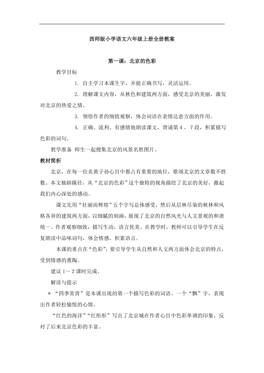 西师版小学语文六年级上册全册教案西师版小学语文六年级上册全册教案第一课:北京的色彩第一课:北京的色彩教学目标1. 自主学习本课生字,并能正确书写,灵活运用2. 理解课文内容,从秋色和建筑两方面,感受北京的美丽,激发对北京的热爱之情3. 领悟作者的细致观察,体会词语在表情达意方面的作用4. 正确、流利、有感情地朗读课文,背诵第4、7段,积累描写色彩的词句教学准备 师生一起搜集北京的风景名胜图片教材简析教材简析北京,在每一位炎黄子孙心目中都占有重要的地位,歌颂北京的文章数不胜数本文独辟蹊径,从“北京的色彩”这个独特的视角描绘了北京的美好,激起我们内心深处的感动课文先用“壮丽而辉煌”五个字写总体感受,然后从层林尽染的秋林和风格各异的建筑两方面,以细腻的刻画,展现了北京的自然风光与人文景观的和谐统一作者观察细致,描写生动,语言优美在教学时,教师可以引导学生在反复朗读中品味词句,体会情感,积累语言本课的重点在“色彩” ,要引导学生从自然和人文两方面体会北京的特点,受到情感的熏陶建议 1~2课时完成解读与提示* “四季常青”是本课出现的第一个描写色彩的词语一个“飘”字,表现出作者轻松愉悦的心情红色的海洋” “红彤彤”写出了北京城在作者心目中色彩单调的印象,反衬了后来北京色彩的丰富。