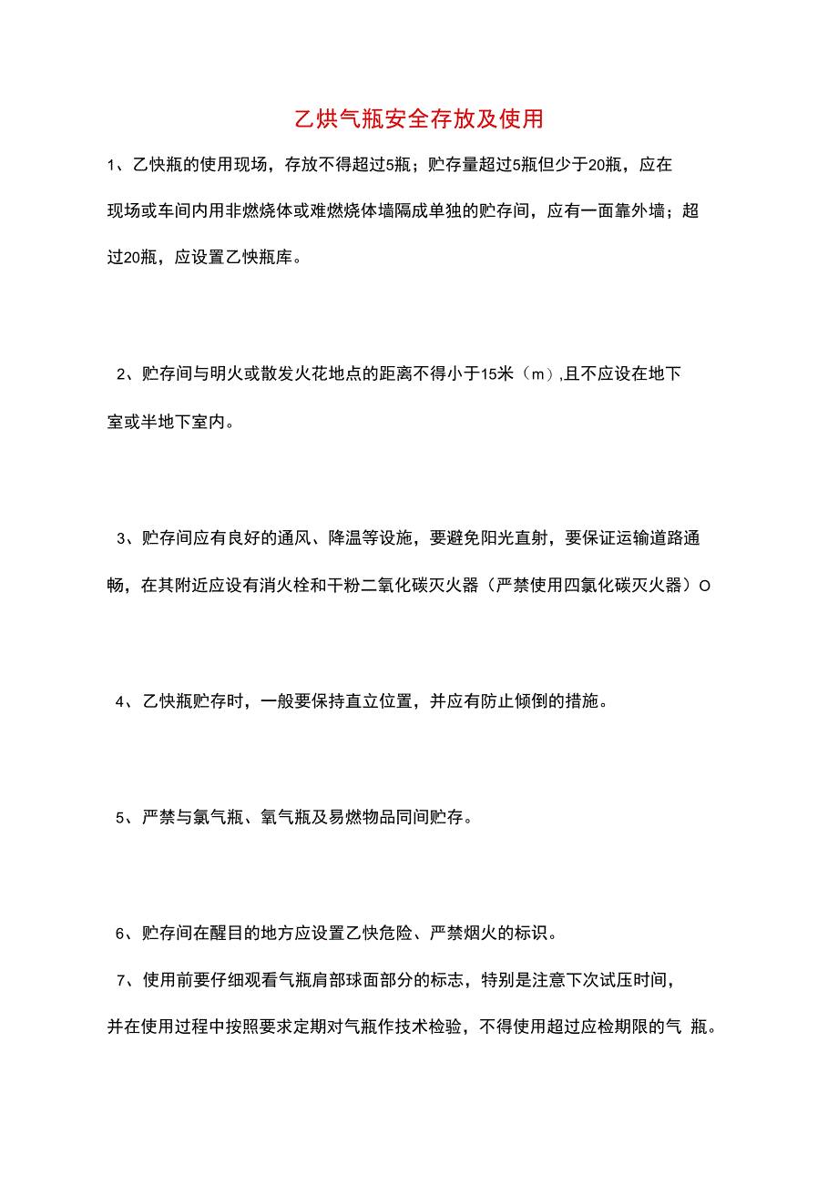 乙烘气瓶安全存放及使用1、乙快瓶的使用现场,存放不得超过5瓶;贮存量超过5瓶但少于20瓶,应在 现场或车间内用非燃烧体或难燃烧体墙隔成单独的贮存间,应有一面靠外墙;超 过20瓶,应设置乙怏瓶库2、 贮存间与明火或散发火花地点的距离不得小于15米(m),且不应设在地下 室或半地下室内3、 贮存间应有良好的通风、降温等设施,要避免阳光直射,要保证运输道路通 畅,在其附近应设有消火栓和干粉二氧化碳灭火器(严禁使用四氯化碳灭火器)O4、 乙快瓶贮存时,一般要保持直立位置,并应有防止倾倒的措施5、 严禁与氯气瓶、氧气瓶及易燃物品同间贮存6、 贮存间在醒目的地方应设置乙快危险、严禁烟火的标识7、 使用前要仔细观看气瓶肩部球面部分的标志,特别是注意下次试压时间, 并在使用过程中按照要求定期对气瓶作技术检验,不得使用超过应检期限的气 瓶8、 使用时,首先要做外部检查’检查重点是瓶阀、接管螺纹、减压器等;如果 发现有漏气、滑扣、表针动作不灵或爬高等,应及时维修,切忌随便处理.禁 止带压拧紧阀杆,调整垫料检查漏气时应用可燃气体检测仪检测,或用肥皂水, 不得使用明火8、 乙快瓶与电焊在同一场所使用时,瓶底应垫上绝缘物,以防气瓶带电;与乙 快气瓶接触的管道和设备要有接地装置,防止由于产生静电造成燃烧或爆炸。